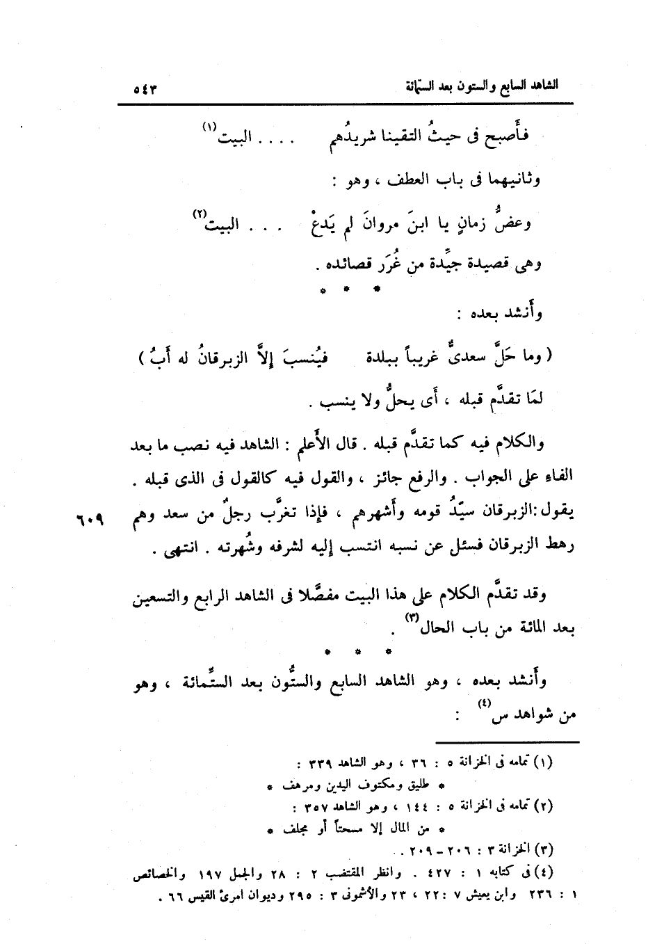 فَأصْبح فِي حَيْثُ الْتَقَيْنَا شريدهم ... ... ... ... . . الْبَيْت وَثَانِيهمَا فِي بَاب الْعَطف وَهُوَ: وعض زمانٍ يَا ابْن مَرْوَان لم يدع ... ... ... ... ... الْبَيْت وَهِي قصيدة جَيِّدَة من غرر قصائده.