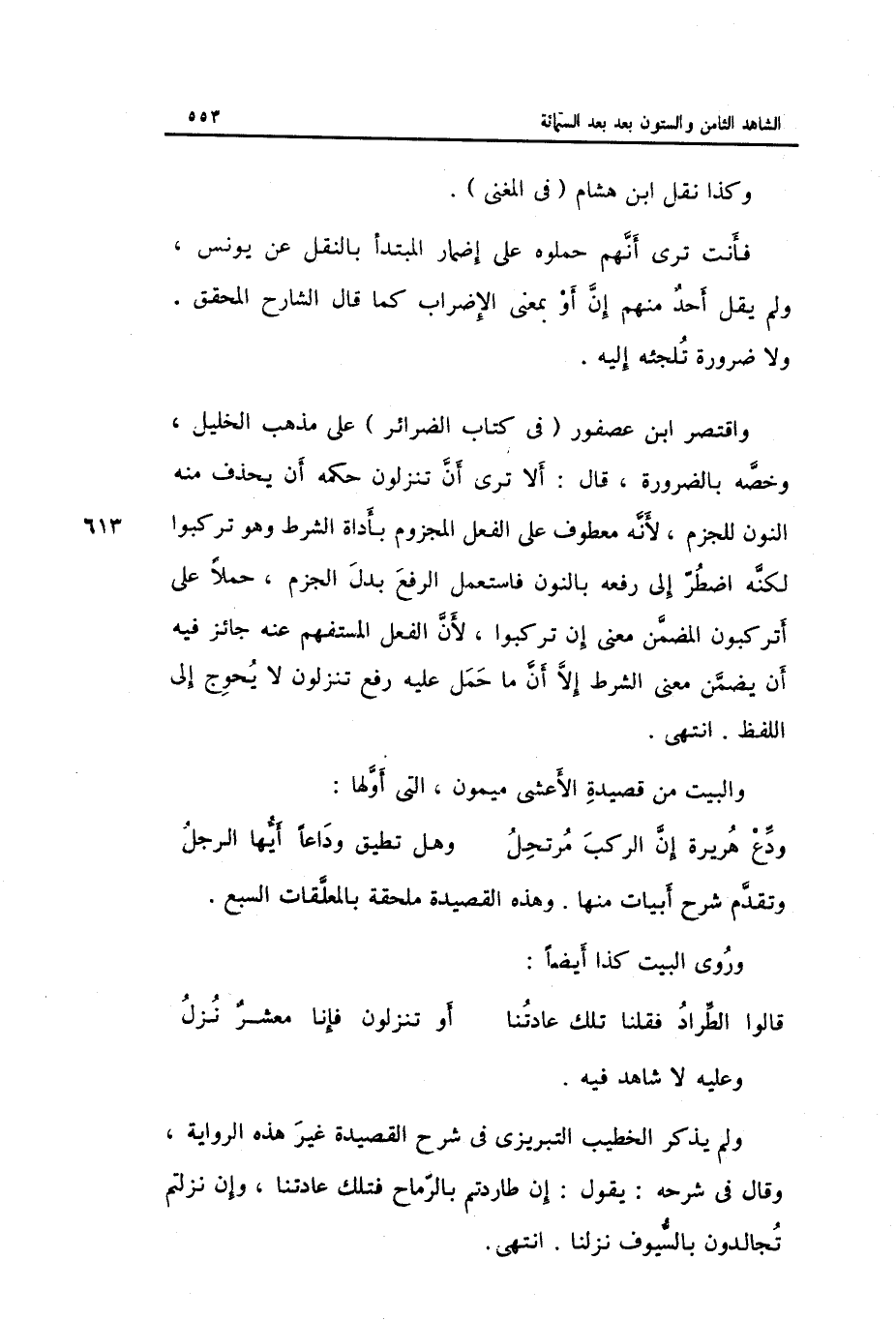 وَاقْتصر ابْن عُصْفُور فِي كتاب الضرائر على مَذْهَب الْخَلِيل وَخَصه بِالضَّرُورَةِ قَالَ: أَلا ترى أَن تَنْزِلُونَ حكمه أَن تحذف مِنْهُ النُّون للجزم لِأَنَّهُ مَعْطُوف على الْفِعْل المجزوم بأداة الشَّرْط وَهُوَ تركبوا لكنه اضْطر إِلَى رَفعه بالنُّون فَاسْتعْمل الرّفْع بدل الْجَزْم حملا على أتركبون المضمن معنى إِن تركبوا لِأَن الْفِعْل المستفهم عَنهُ جَائِز فِيهِ أَن يضمن معنى الشَّرْط إِلَّا أَن مَا حمل عَلَيْهِ رفع تَنْزِلُونَ لَا