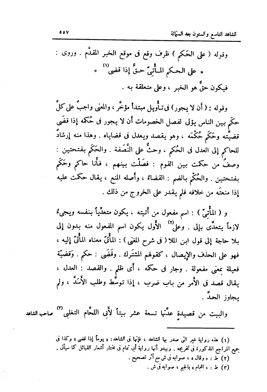 وَقَوله: أَن لَا يجوز فِي تَأْوِيل مُبْتَدأ مُؤخر وَالْمعْنَى واجبٌ على كل حكم بَين النَّاس يُؤْتى لفصل الْخُصُومَات أَن لَا يجور فِي حكمه إِذا قضى قَضيته وَحكم حكمه وَهُوَ يقْصد ويعدل فِي قضاياه.