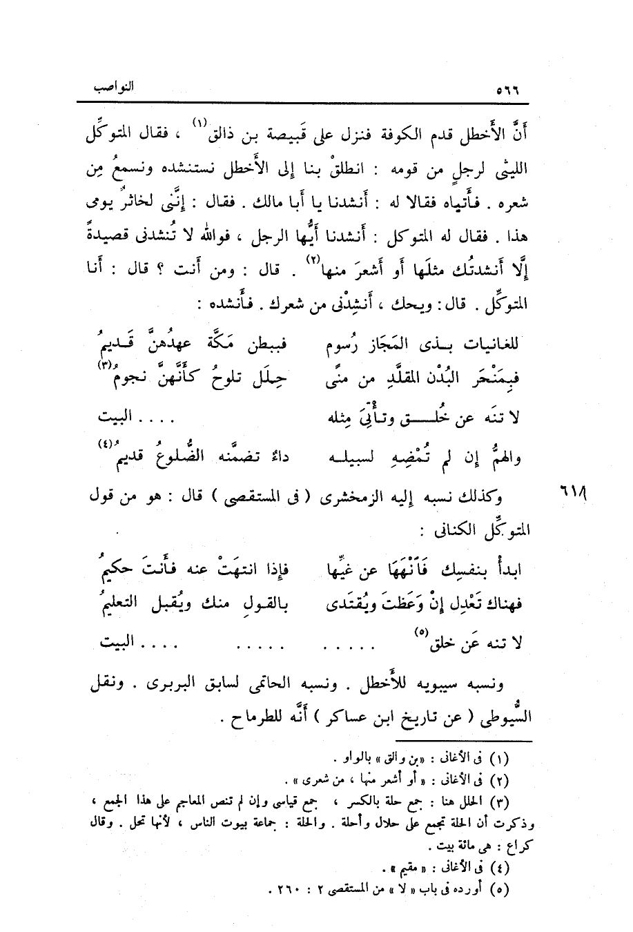 أَن الأخطل قدم الْكُوفَة فَنزل على قبيصَة بن ذالق فَقَالَ المتَوَكل اللَّيْثِيّ لرجلٍ من قومه: انْطلق بِنَا إِلَى الأخطل نستنشده ونسمع من شعره. فَأتيَاهُ فَقَالَا لَهُ: أنشدنا يَا أَبَا مَالك. فَقَالَ: إِنَّنِي لخاثرٌ يومي هَذَا.