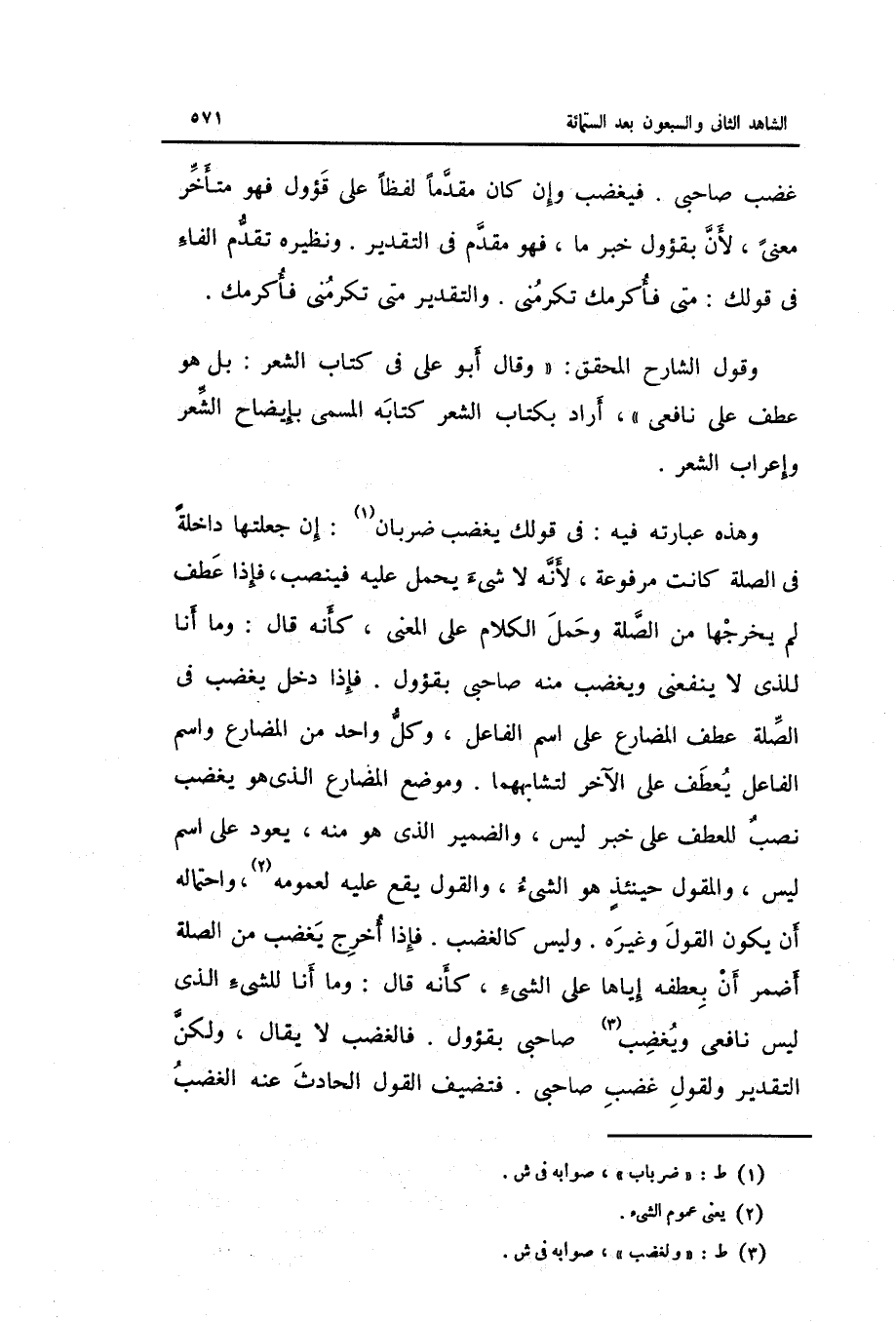 فيغضب وَإِن كَانَ مقدما لفظا على قؤول فَهُوَ مُتَأَخّر معنى لِأَن بقؤول خبر مَا فَهُوَ مقدم فِي وَقَول الشَّارِح الْمُحَقق: وَقَالَ أَبُو عَليّ فِي كتاب الشّعْر: بل هُوَ عطف على نافعي أَرَادَ بِكِتَاب الشّعْر كِتَابه الْمُسَمّى بإيضاح الشّعْر وإعراب الشّعْر.