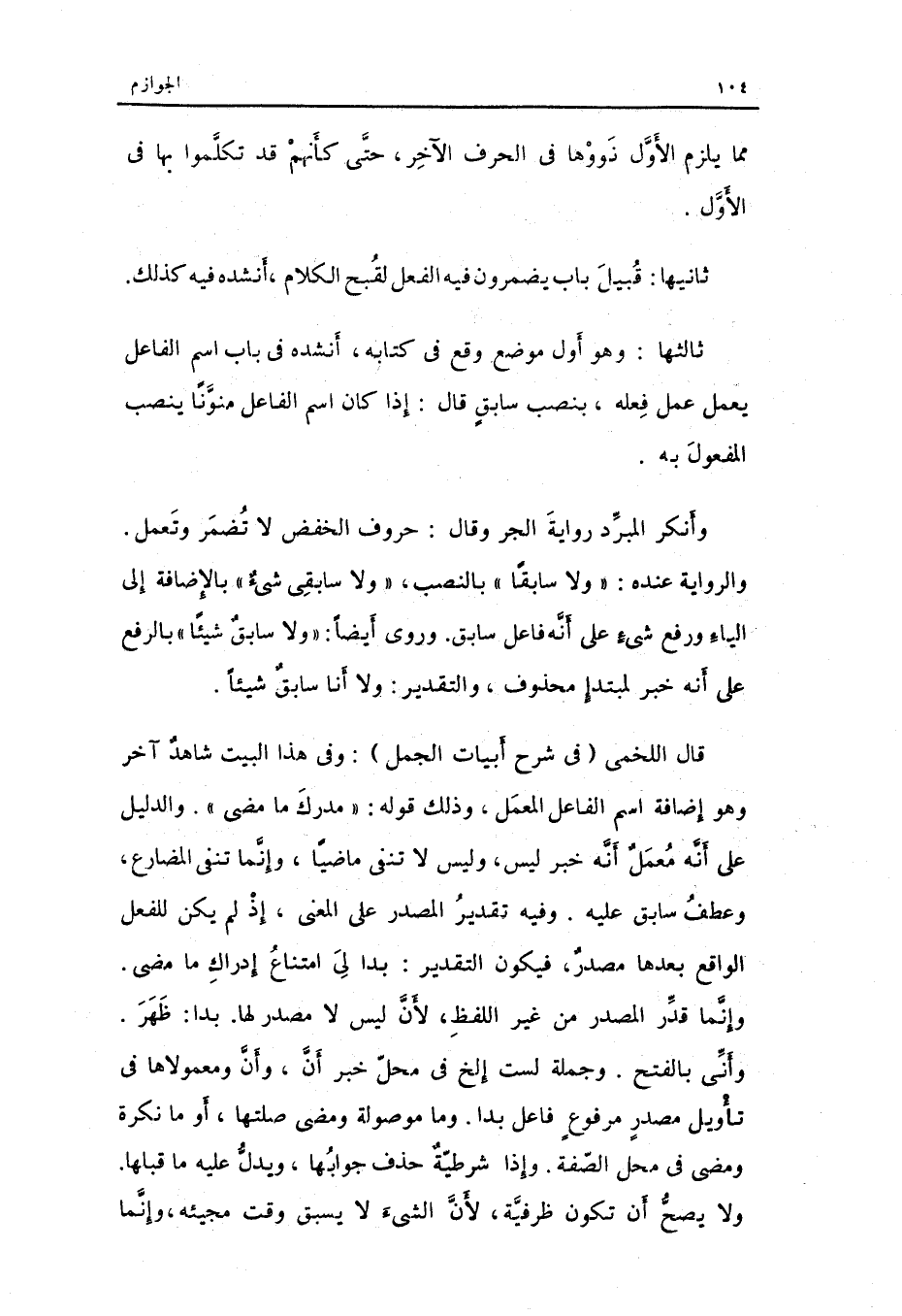 ثَالِثهَا: وَهُوَ أول مَوضِع وَقع فِي كِتَابه أنْشدهُ فِي بَاب اسْم الْفَاعِل يعْمل عمل فعله بِنصب سَابق قَالَ: إِذا كَانَ اسْم الْفَاعِل منوناً ينصب الْمَفْعُول بِهِ.