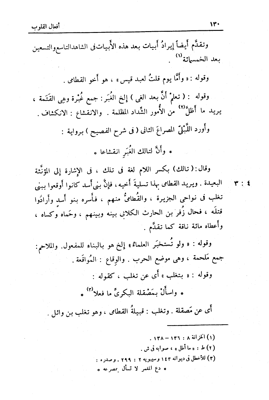 وَأورد اللبلي المصراع الثَّانِي فِي شرح الفصيح بِرِوَايَة: وَأَن لتالك الغبر انقشاعاً وَقَالَ: تالك بِكَسْر اللَّام لُغَة فِي تِلْكَ فِي الْإِشَارَة إِلَى المؤنثة الْبَعِيدَة. وَيُرِيد الْقطَامِي بِهَذَا تَسْلِيَة أَخِيه فَإِن بني أَسد كَانُوا أوقعوا ببني تغلب فِي نواحي الجزيرة والقطامي مِنْهُم فَأسرهُ بَنو أَسد وَأَرَادُوا قَتله فحال زفر بن الْحَارِث الْكلابِي بَينه وَبينهمْ وحماه وكساه وَأَعْطَاهُ مائَة نَاقَة كَمَا تقدم.