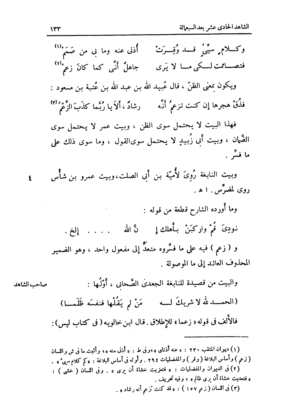 وَزعم فِيهِ على مَا فسروه مُتَعَدٍّ إِلَى مفعول وَاحِد وَهُوَ الضَّمِير الْمَحْذُوف الْعَائِد إِلَى مَا وَالْبَيْت من قصيدة للنابغة الْجَعْدِي الصَّحَابِيّ أَولهَا: