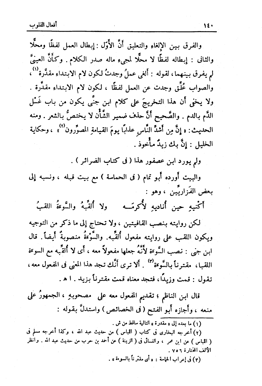 وَلَا يخفى أَن هَذَا التَّخْرِيج على كَلَام ابْن جني يكون من بَاب غسل الدَّم بِالدَّمِ. وَالصَّحِيح أَن حذف ضمير الشَّأْن لَا يخْتَص بالشعر. وَمِنْه الحَدِيث: إِن من أَشد النَّاس عذَابا يَوْم الْقِيَامَة المصورون وحكاية الْخَيل: إِن بك زيد مَأْخُوذ.