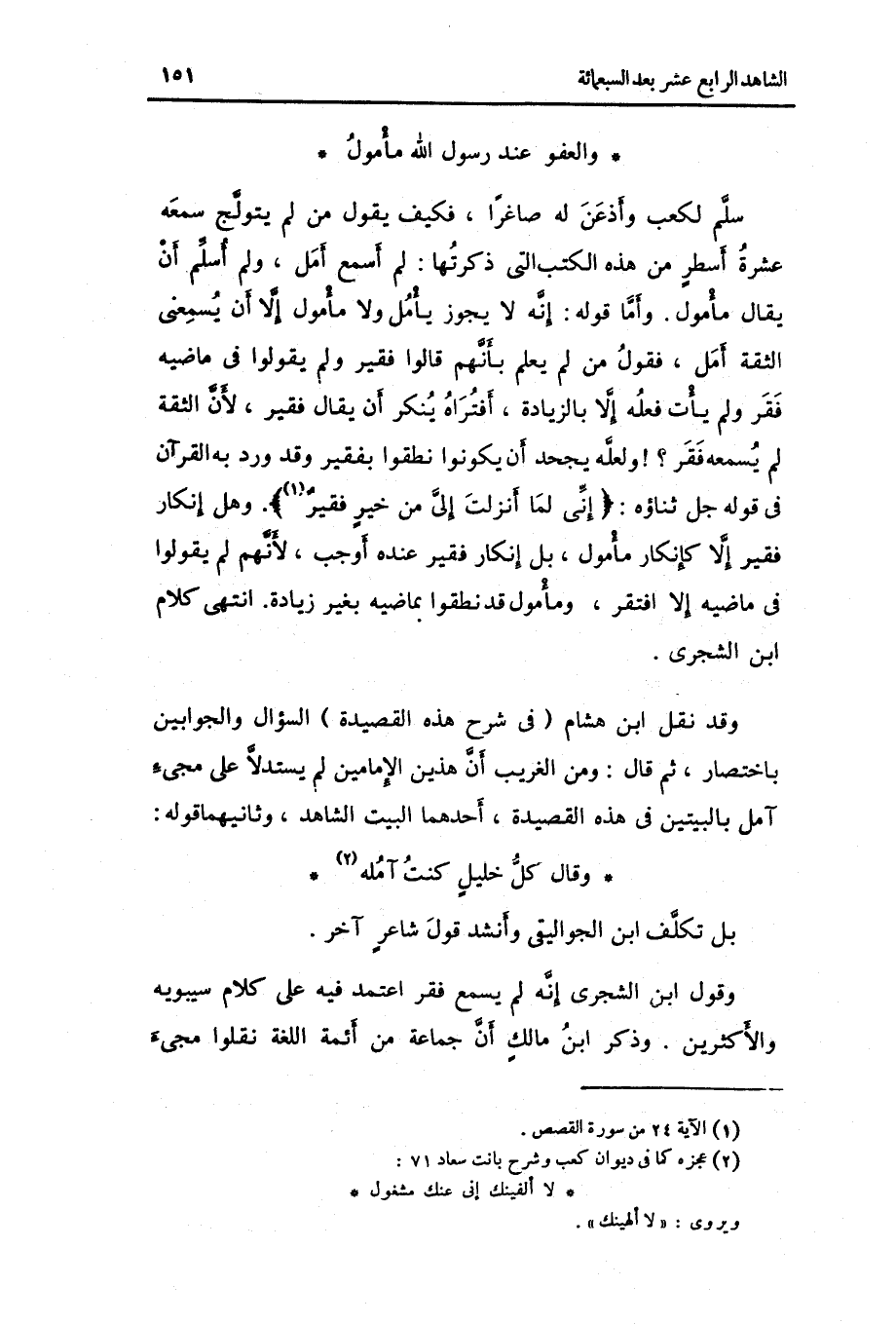 وَقد نقل ابْن هِشَام فِي شرح هَذِه القصيدة السُّؤَال والجوابين بِاخْتِصَار ثمَّ قَالَ: وَمن الْغَرِيب أَن هذَيْن الْإِمَامَيْنِ لم يستدلاً على مَجِيء آمل بالبيتين فِي هَذِه القصيدة أَحدهمَا الْبَيْت الشَّاهِد وَثَانِيهمَا قَوْله: وَقَالَ كل خَلِيل كنت آمله بل تكلّف ابْن الجواليقي وَأنْشد قَول شَاعِر آخر.