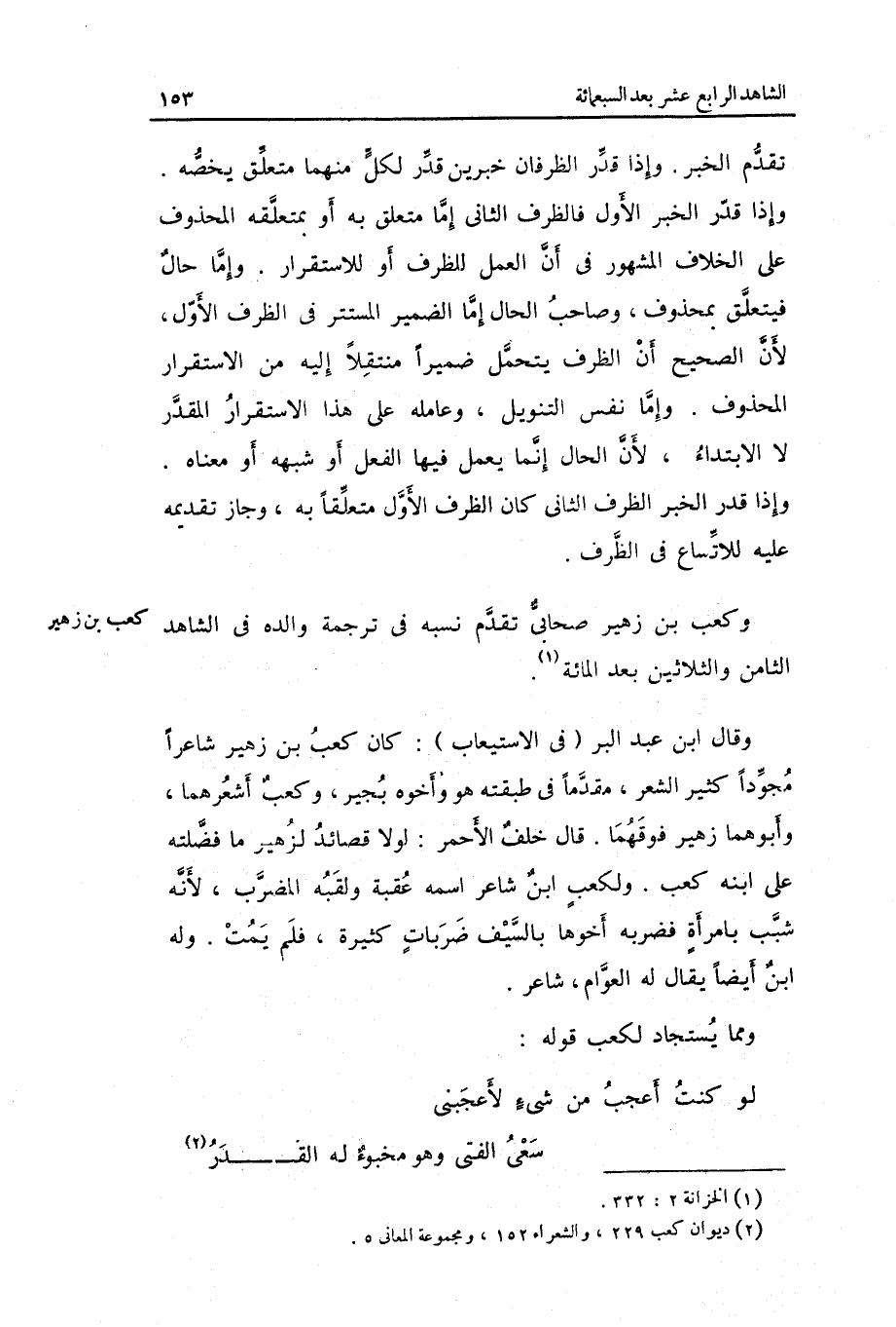 وَكَعب بن زُهَيْر صَحَابِيّ تقدم نسبه فِي تَرْجَمَة وَالِده فِي الشَّاهِد الثَّامِن وَالثَّلَاثِينَ بعد الْمِائَة.