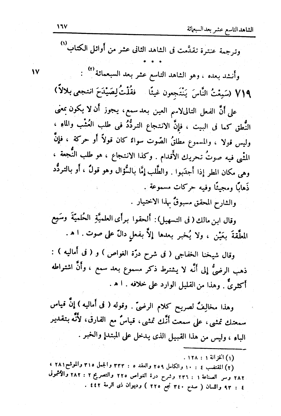 على أَن الْفِعْل التَّالِي لاسم الْعين بعد سمع يجوز أَن لَا يكون بِمَعْنى النُّطْق كَمَا فِي الْبَيْت فَإِن الانتجاع التَّرَدُّد فِي طلب العشب وَالْمَاء وَلَيْسَ قولا والمسموع مُطلق الصَّوْت سَوَاء كَانَ قولا أَو حَرَكَة فَإِن الْمَشْي فِيهِ صَوت تَحْرِيك الْأَقْدَام.