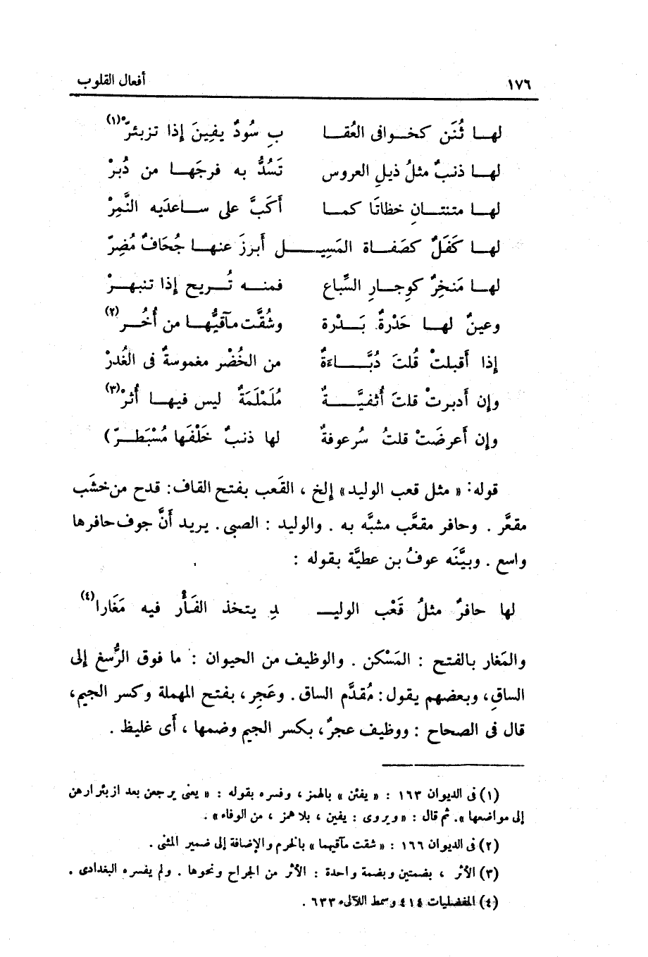 قَوْله: مثل قَعْب الْوَلِيد ... إِلَخ الْعقب بِفَتْح الْقَاف: قدح من خشب مقعر. وحافر مقعب مشبه بِهِ. والوليد: الصَّبِي. يُرِيد أَن جَوف حافرها وَاسع. وَبَينه عَوْف بن عَطِيَّة بقوله: المتقارب والمغار: بِالْفَتْح الْمسكن. والوظيف من الْحَيَوَان: مَا فَوق الرسغ إِلَى السَّاق وَبَعْضهمْ يَقُول: مقدم السَّاق.)