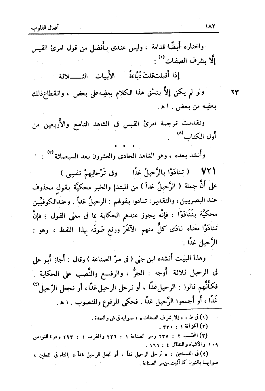 على أَن جملَة الرحيل غَدا من الْمُبْتَدَأ وَالْخَبَر محكية بقول مَحْذُوف عِنْد الْبَصرِيين وَالتَّقْدِير: تنادوا بقَوْلهمْ: الرحيل غَدا. وَعند الْكُوفِيّين محكية بتنادوا فَإِنَّهُ يجوز عِنْدهم الْحِكَايَة بِمَا فِي معنى القَوْل فَإِن تنادوا مَعْنَاهُ نَادَى على كل مِنْهُم الآخر وَرفع صَوته بِهَذَا اللَّفْظ وَهُوَ الرحيل غَدا.