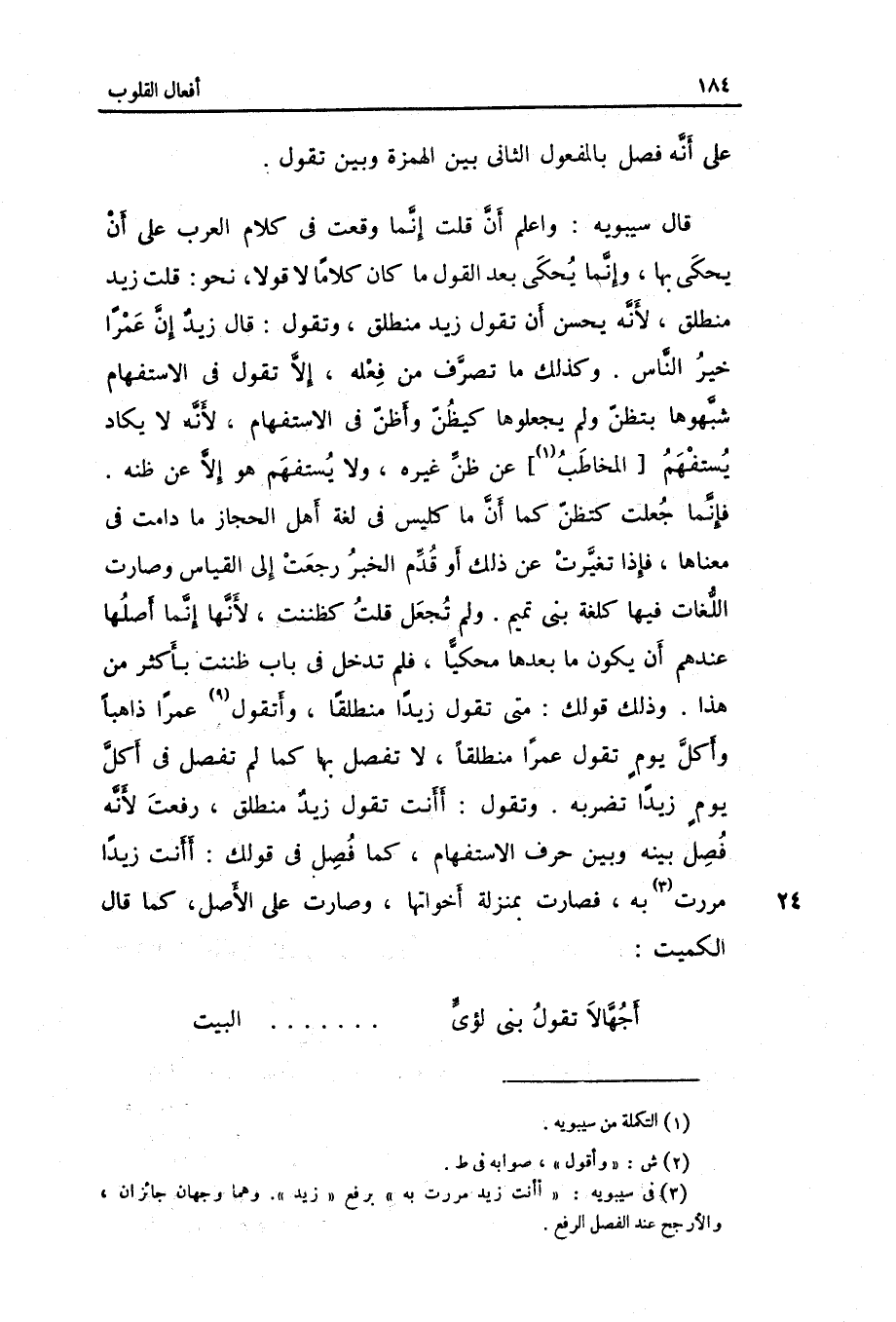 وَتقول: أَأَنْت تَقول زيد منطلق رفعت لِأَنَّهُ فصل بَينه وَبَين حرف الِاسْتِفْهَام كَمَا فصل فِي قَوْلك: أَأَنْت زيدا مَرَرْت بِهِ فَصَارَت بِمَنْزِلَة أخواتها وَصَارَت على الأَصْل كَمَا قَالَ الْكُمَيْت: أجهالاً تَقول بني لؤَي ... ... ... ... الْبَيْت