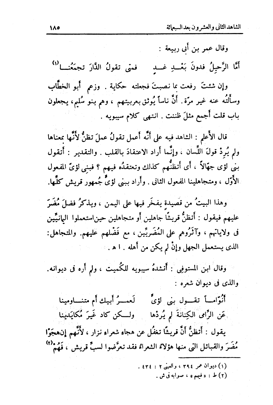 وَالتَّقْدِير: أَتَقول بني لؤَي جُهَّالًا أَي: أتظنهم كَذَلِك وتعتقده فيهم فَبنِي لؤَي الْمَفْعُول الأول ومتجاهلينا الْمَفْعُول الثَّانِي. وَأَرَادَ ببني لؤَي جُمْهُور قُرَيْش كلهَا)
