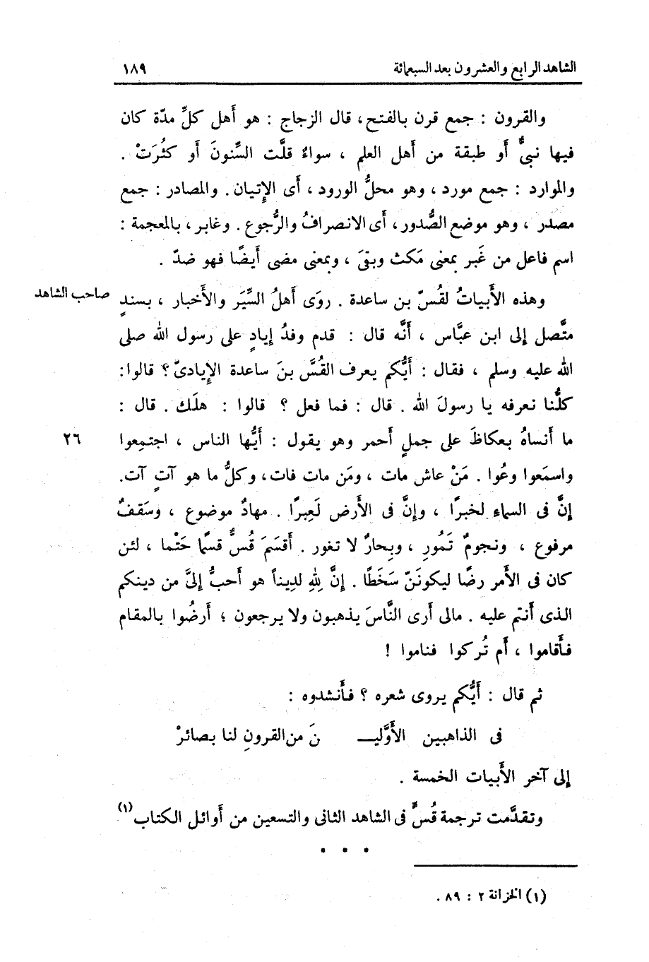 وَهَذِه الأبيات لقس بن سَاعِدَة. روى أهل السّير وَالْأَخْبَار بِسَنَد مُتَّصِل إِلَى ابْن عَبَّاس أَنه قَالَ: قدم وَفد إياد على رَسُول الله صَلَّى اللَّهُ عَلَيْهِ وَسَلَّم َ فَقَالَ: أَيّكُم يعرف القس بن سَاعِدَة الْإِيَادِي قَالُوا: كلنا نعرفه يَا رَسُول الله. قَالَ: فَمَا فعل قَالُوا: هلك.