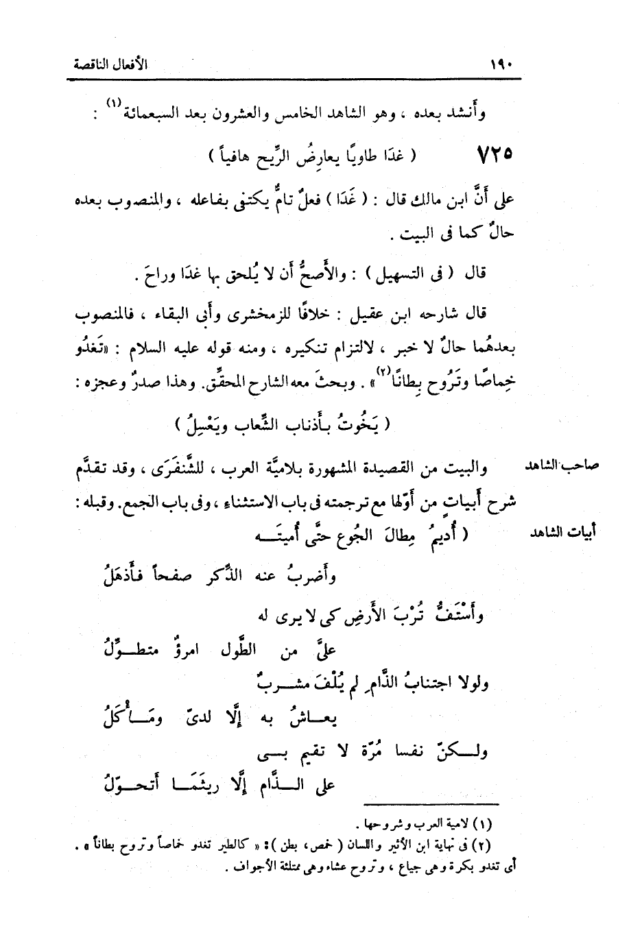 الطَّوِيل غَدا طاوياً يُعَارض الرّيح هافياً على أَن ابْن مَالك قَالَ: غَدا فعل تَامّ يَكْتَفِي بفاعله والمنصوب بعده حَال كَمَا فِي الْبَيْت.