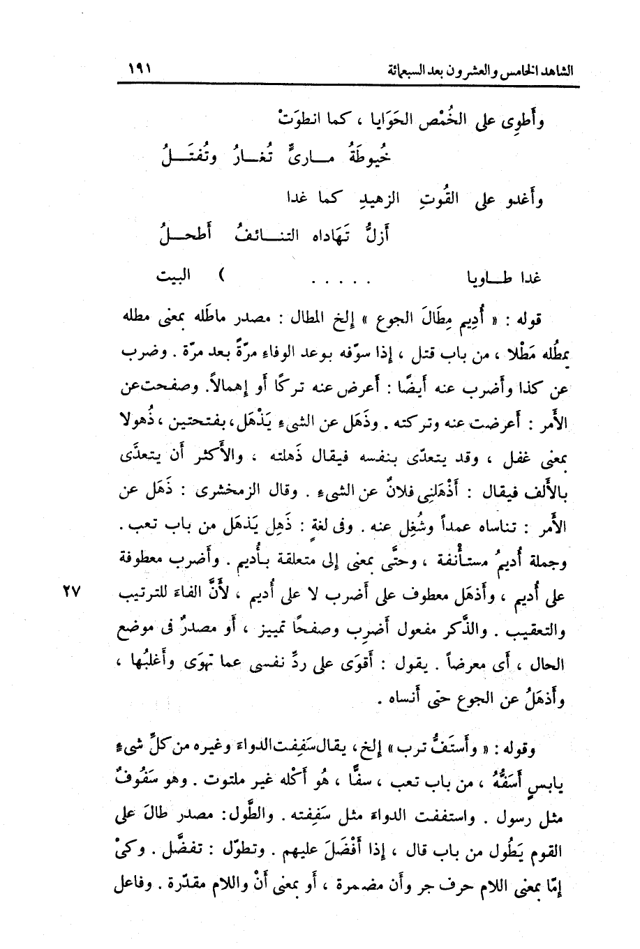 غَدا طاوياً ... ... ... ... ... ... ... ... ... ... . الْبَيْت قَوْله: أَدِيم مطال الْجُوع ... إِلَخ المطال: مصدر ماطله بِمَعْنى مطله يمطله مطلاً من بَاب قتل إِذا سوفه بوعد الْوَفَاء مرّة بعد مرّة. وَضرب عَن كَذَا وأضرب عَنهُ أَيْضا: أعرض عَنهُ تركا أَو وَذهل عَن الشَّيْء يذهل بِفتْحَتَيْنِ ذهولاً بِمَعْنى غفل وَقد يتَعَدَّى بِنَفسِهِ فَيُقَال: ذهلته وَالْأَكْثَر أَن يتَعَدَّى بِالْألف فَيُقَال: أذهلني فلَان عَن الشَّيْء.)