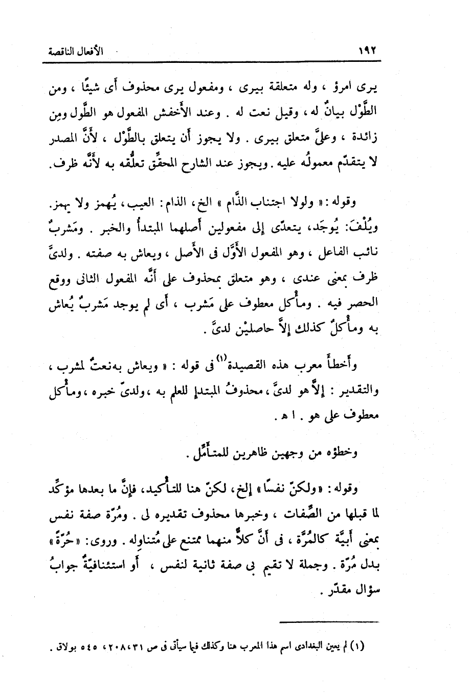 وَأَخْطَأ مُعرب هَذِه القصيدة فِي قَوْله: ويعاش بِهِ نعت لمشرب وَالتَّقْدِير: إِلَّا هُوَ لدي مَحْذُوف الْمُبْتَدَأ للْعلم بِهِ وَلَدي خَبره ومأكل مَعْطُوف على هُوَ. اه.