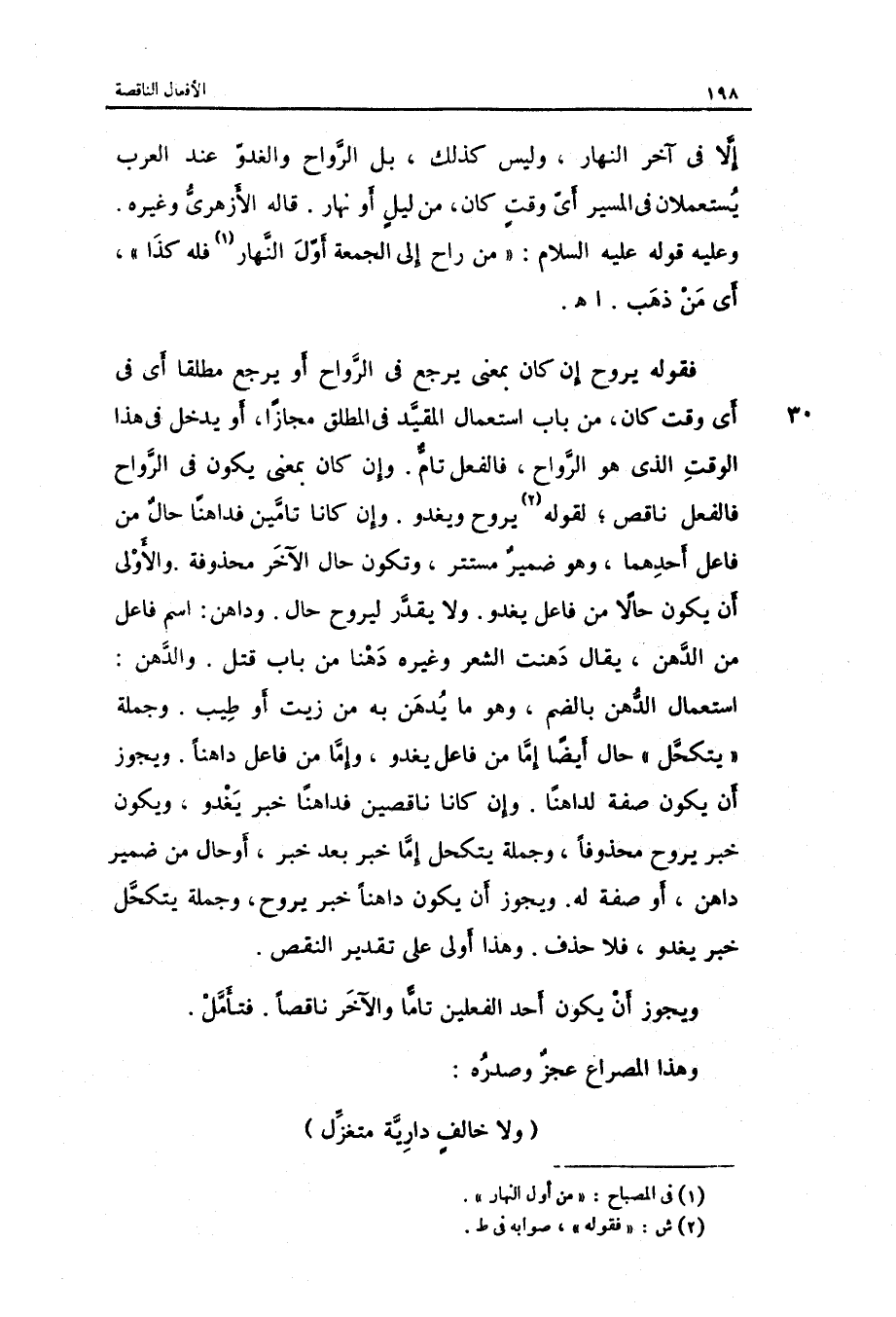وَإِن كَانَا ناقصين فداهناً خبر يَغْدُو وَيكون خبر يروح محذوفاً وَجُمْلَة: يتكحل إِمَّا خبر بعد خبر أَو حَال من ضمير داهن أَو صفة لَهُ. وَيجوز أَن يكون داهناً خبر يروح وَجُمْلَة: يتكحل خبر يَغْدُو فَلَا حذف. وَهَذَا أولى على تَقْدِير النَّقْص.
