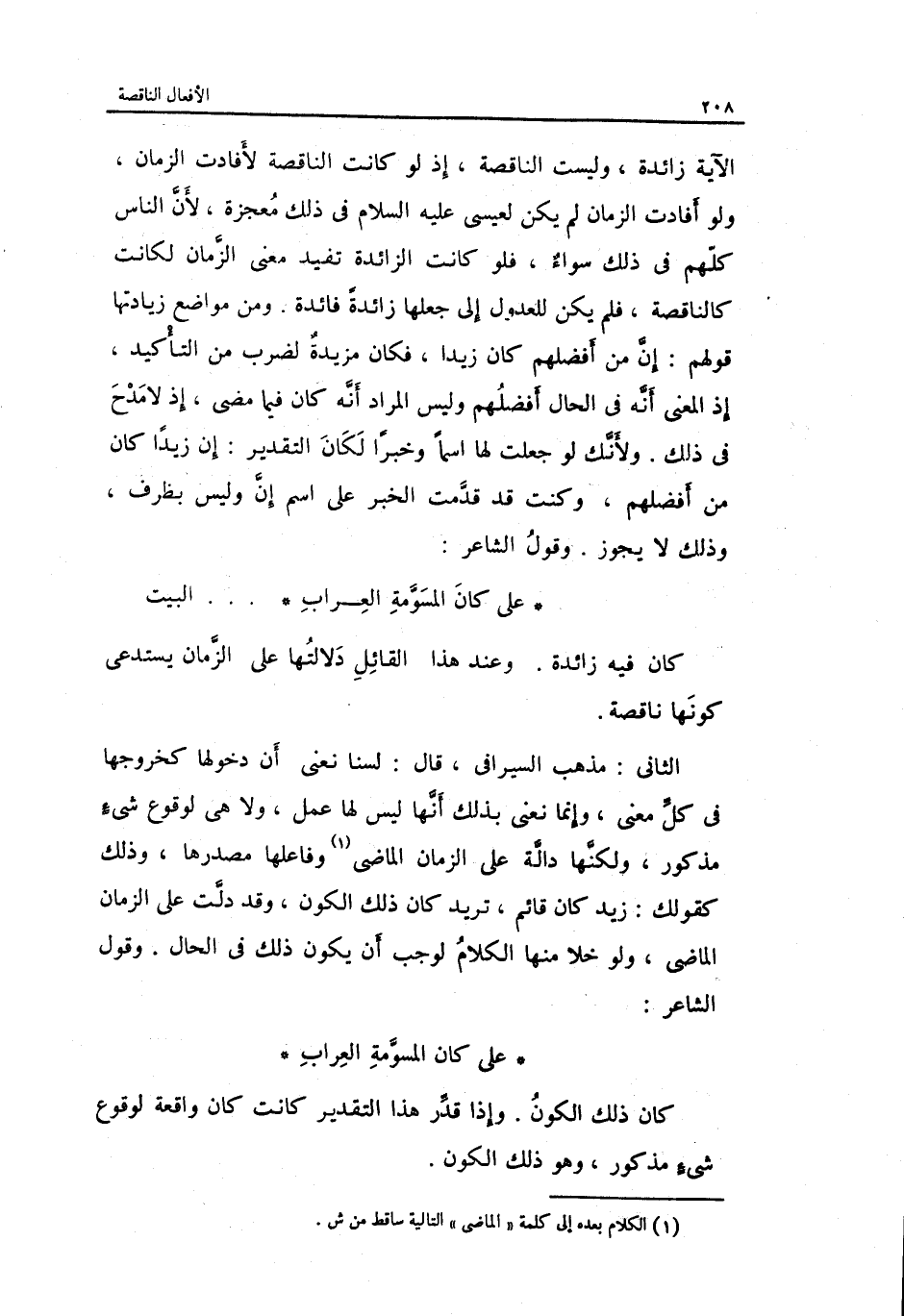 وَقَول الشَّاعِر: على كَانَ المسومة العراب الْبَيْت كَانَ فِيهِ زَائِدَة. وَعند هَذَا الْقَائِل دلالتها على الزَّمَان يَسْتَدْعِي كَونهَا نَاقِصَة.)