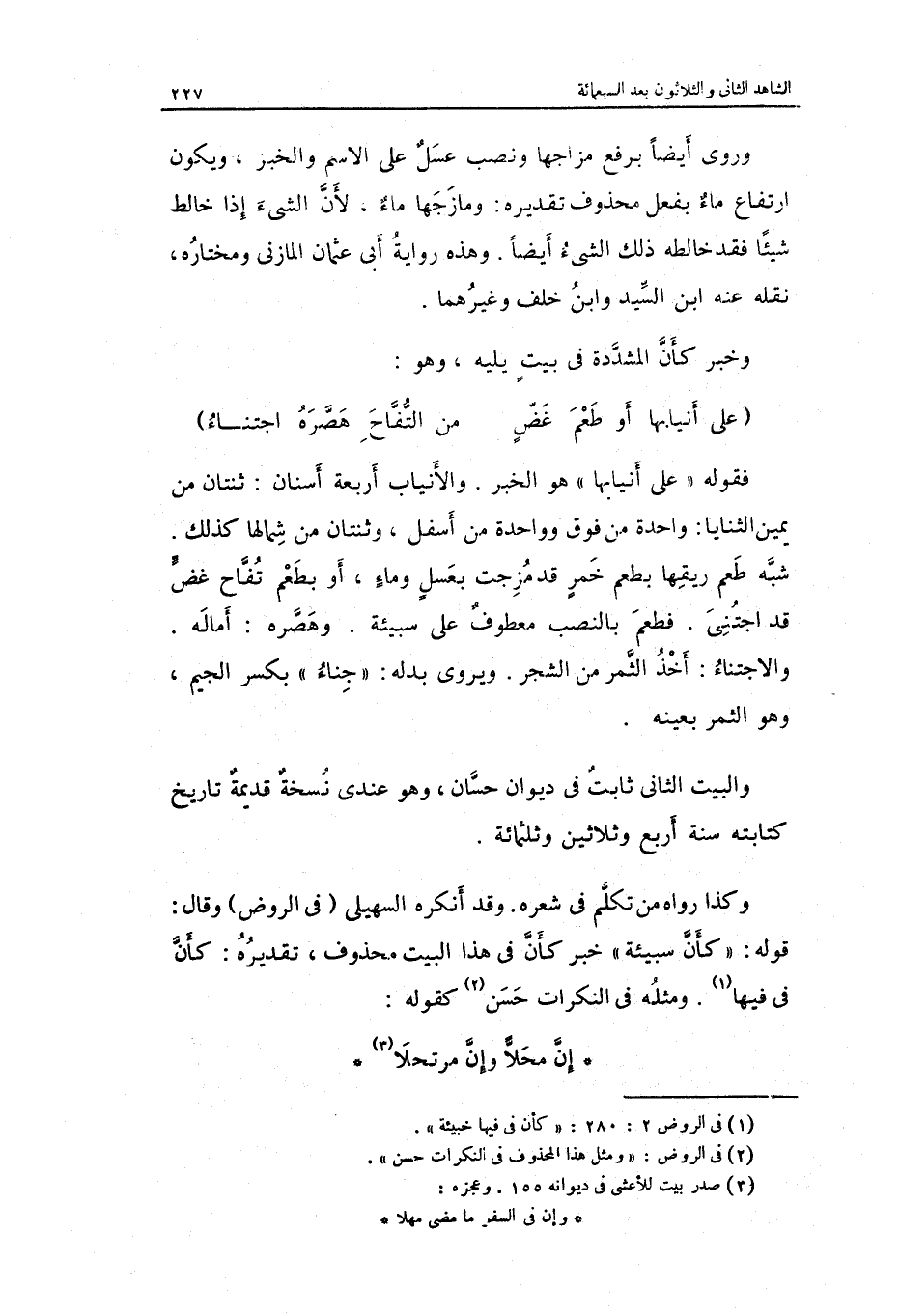 وَكَذَا رَوَاهُ من تكلم فِي شعره. وَقد أنكرهُ السُّهيْلي فِي الرَّوْض وَقَالَ: قَوْله: كَأَن سبيئة خبر كَأَن فِي هَذَا الْبَيْت مَحْذُوف تَقْدِيره: كَأَن فِي فِيهَا. وَمثله فِي النكرات حسن كَقَوْلِه: المنسرح