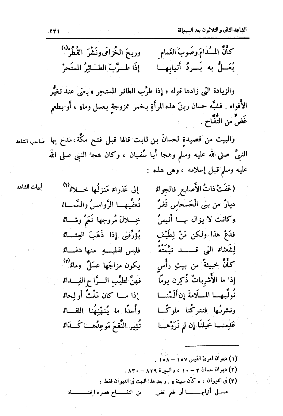 وَالزِّيَادَة الَّتِي زَادهَا قَوْله: إِذا طرب الطَّائِر المستحر يَعْنِي عِنْد تغير الأفواه. فَشبه حسان ريق هَذِه الْمَرْأَة بِخَمْر ممزوجة بِعَسَل وَمَاء أَو بطعم غض من التفاح.