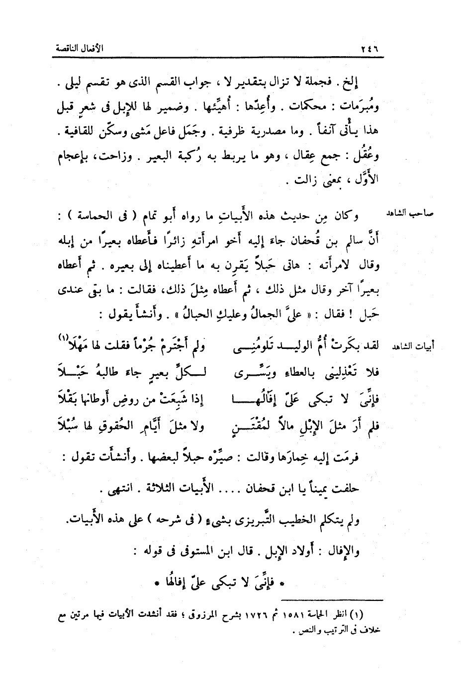 وَمَا مَصْدَرِيَّة ظرفية. وجمل فَاعل مَشى وَسكن للقافية. وعقل: جمع عقال وَهُوَ مَا يرْبط بِهِ وَكَانَ من حَدِيث هَذِه الأبيات مَا رَوَاهُ أَبُو تَمام فِي الحماسة: أَن سَالم بن قحفان جَاءَ إِلَيْهِ أَخُو امْرَأَته زَائِرًا فَأعْطَاهُ بَعِيرًا من إبِله وَقَالَ لامْرَأَته: هَاتِي حبلاً يقرن بِهِ مَا أعطيناه إِلَى بعير. ثمَّ)