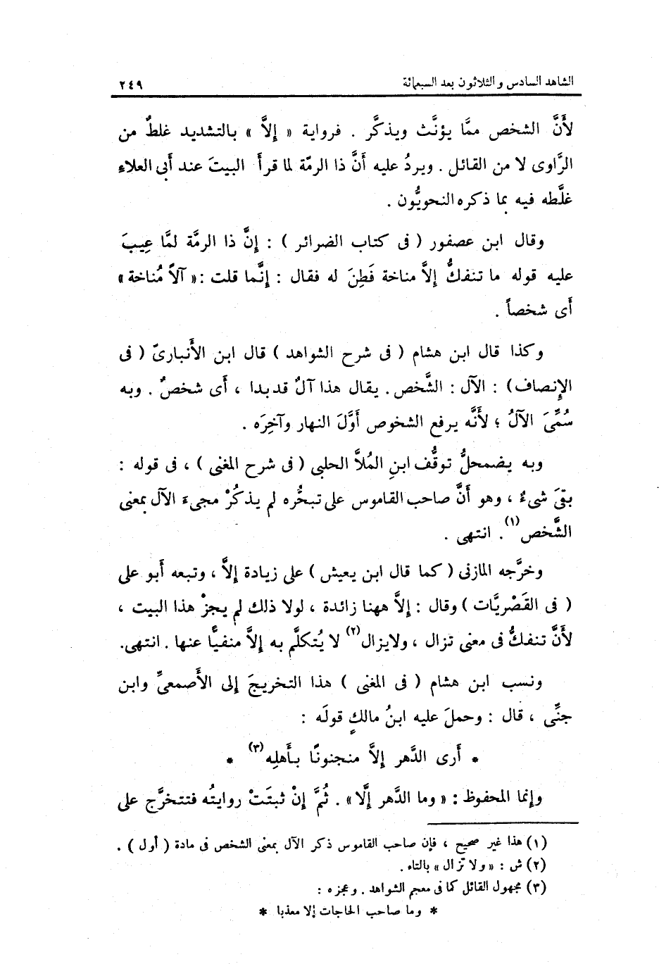 وَقَالَ ابْن عُصْفُور فِي كتاب الضرائر: إِن ذَا الرمة لما عيب عَلَيْهِ قَوْله مَا تنفك إِلَّا مناخة فطن لَهُ فَقَالَ: إِنَّمَا قلت: آلا مناخة أَي: شخصا. وَكَذَا قَالَ ابْن هِشَام فِي شرح الشواهد قَالَ ابْن الْأَنْبَارِي فِي الْإِنْصَاف: ألال: الشَّخْص. يُقَال: هَذَا آل قد بدا أَي: شخص. وَبِه سمي الْآل لِأَنَّهُ يرفع الشخوص أول النَّهَار وَآخره.)