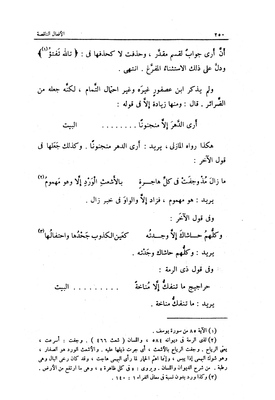 وَلم يذكر ابْن عُصْفُور غَيره وَغير احْتِمَال التَّمام لكنه جعله من الضرائر. قَالَ: وَمِنْهَا زِيَادَة إِلَّا فِي قَوْله: أرى الدَّهْر إِلَّا منجنوناً ... ... ... ... الْبَيْت هَكَذَا رَوَاهُ الْمَازِني يُرِيد: يرى الدَّهْر منجوناً. وَكَذَلِكَ جعلهَا فِي قَول الآخر: الْبَسِيط