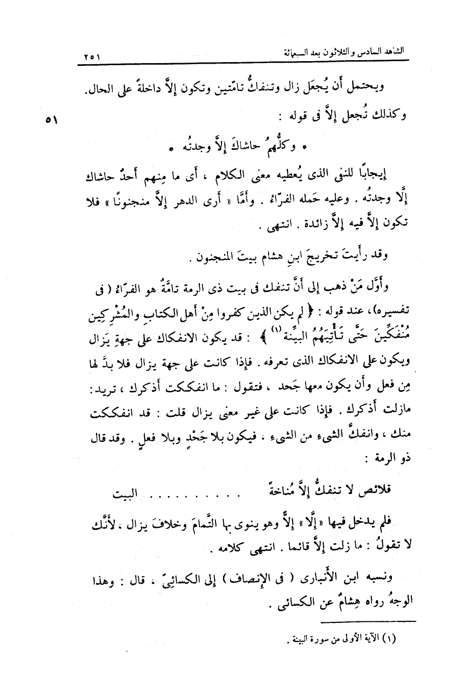 وَأول من ذهب إِلَى أَن تنفك فِي بَيت ذِي الرمة تَامَّة هُوَ الْفراء فِي تَفْسِيره عِنْد قَوْله: لم يكن الَّذين كفرُوا من أهل الْكتاب وَالْمُشْرِكين منفكين حَتَّى تأتيهم الْبَيِّنَة: قد يكون الانفكاك على جِهَة يزَال وَيكون على الانفكاك الَّذِي تعرفه.