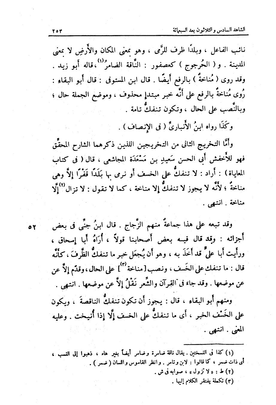 وَقد تبعه على هَذَا جمَاعَة مِنْهُم الزّجاج. قَالَ ابْن جني فِي بعض أَجْزَائِهِ: وَقد قَالَ فِيهِ بعض أَصْحَابنَا قولا أرَاهُ أَبَا إِسْحَاق وَرَأَيْت أَبَا عَليّ قد أَخذ بِهِ وَهُوَ ن يَجْعَل خبر مَا تنفك الظّرْف كَأَنَّهُ قَالَ: مَا تنفك على الْخَسْف وَنصب مناخة على الْحَال وَقدم إِلَّا عَن موضعهَا.