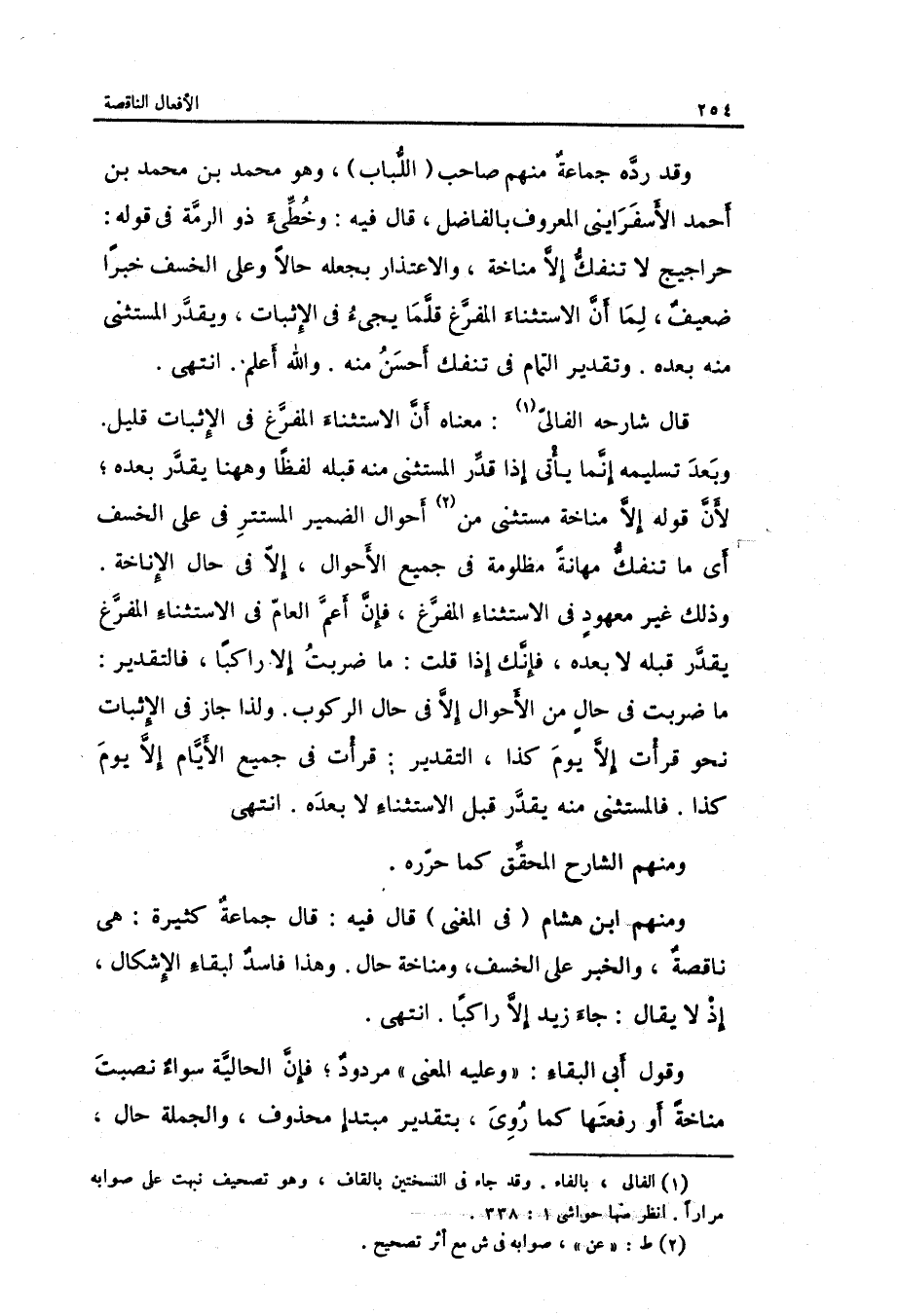 وَقد رده جمَاعَة مِنْهُم صَاحب اللّبَاب وَهُوَ مُحَمَّد بن مُحَمَّد بن أَحْمد الأسفرايني الْمَعْرُوف بِالْفَضْلِ قَالَ فِيهِ: وخطئ ذُو الرمة فِي قَوْله: حراجيج لَا تنفك إِلَّا مناخة والاعتذار بجعله حَالا وعَلى الْخَسْف خَبرا ضَعِيف لما أَن الِاسْتِثْنَاء المفرغ قَلما يَجِيء فِي الْإِثْبَات وَيقدر المستثني مِنْهُ بعده. وَتَقْدِير التَّمام فِي تنفك أحسن مِنْهُ. وَالله أعلم. انْتهى.