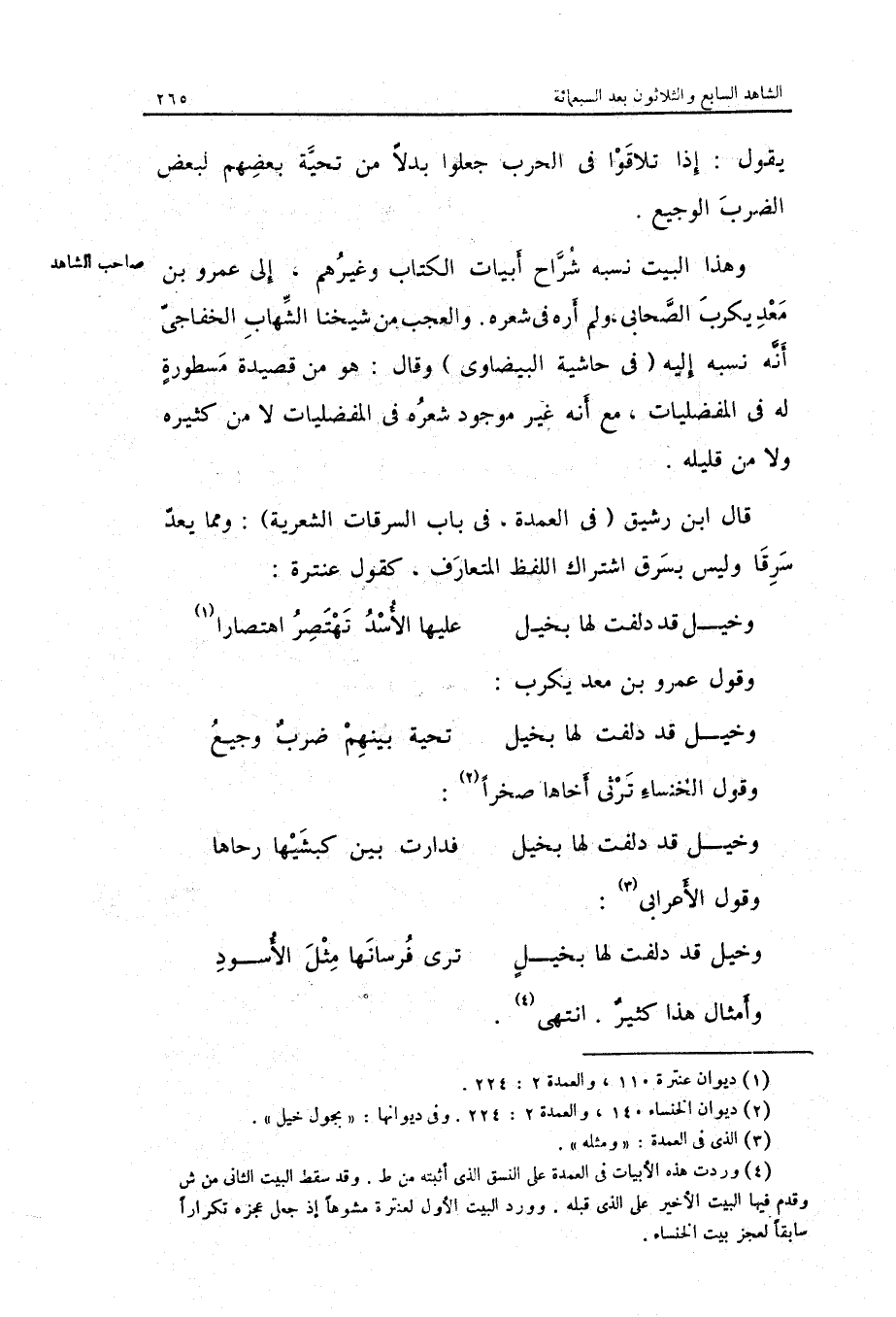 وَالْعجب من شَيخنَا الشهَاب الخفاجي أَنه نسبه إِلَيْهِ فِي حَاشِيَة الْبَيْضَاوِيّ وَقَالَ: هُوَ من قصيدة مسطورة لَهُ فِي المفضليات مَعَ أَنه غير مَوْجُود شعره فِي المفضليات لَا من كَثِيره وَلَا من قَلِيله.