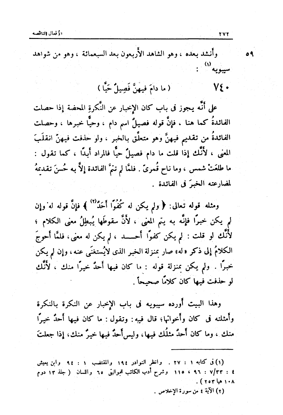 وَهُوَ من شَوَاهِد سِيبَوَيْهٍ: الرجز مَا دَامَ فِيهِنَّ فصيل حَيا على أَنه يجوز فِي بَاب كَانَ الْإِخْبَار عَن النكرَة الْمَحْضَة إِذا حصلت الْفَائِدَة كَمَا هُنَا فَإِن قَوْله: فصيل اسْم دَامَ. وَحيا خَبَرهَا وحصلت الْفَائِدَة من تَقْدِيم فِيهِنَّ وَهُوَ مُتَعَلق بالْخبر وَلَو حذفت فِيهِنَّ انْقَلب الْمَعْنى لِأَنَّك إِذا قلت: مَا دَامَ فصيل حَيا فَالْمُرَاد أبدا كَمَا تَقول: مَا طلعت شمس وَمَا ناح قمري. فَلَمَّا لم تتمّ الْفَائِدَة إِلَّا بِهِ حسن تَقْدِيمه لمضارعته الْخَبَر فِي الْفَائِدَة.