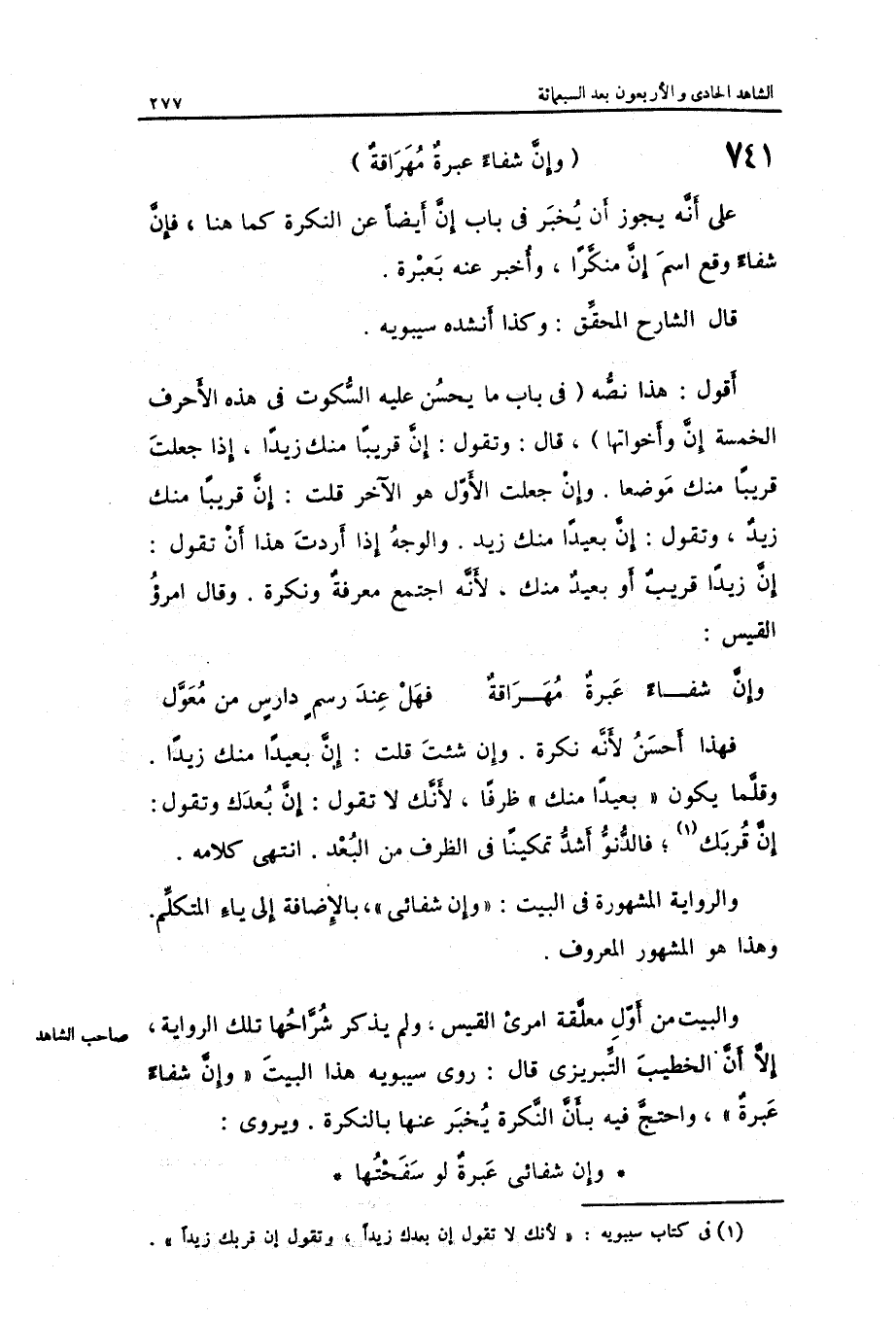 وَالْبَيْت من أول معلقَة امْرِئ الْقَيْس وَلم يذكر شراحها تِلْكَ الرِّوَايَة إِلَّا أَن الْخَطِيب التبريزي قَالَ: روى سِيبَوَيْهٍ هَذَا الْبَيْت وَإِن شِفَاء عِبْرَة وَاحْتج فِيهِ بِأَن النكرَة يخبر عَنْهَا بالنكرة.