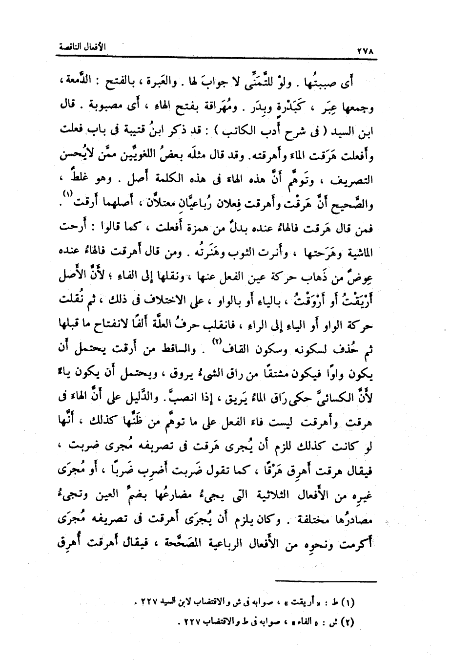 قَالَ ابْن السَّيِّد فِي شرح أدب الْكَاتِب: قد ذكر ابْن قُتَيْبَة فِي بَاب فعلت وأفعلت هرقت المَاء وأهرقته. وَقد قَالَ مثله بعض اللغويين مِمَّن لَا يحسن التصريف وتوهم أَن هَذِه الْهَاء فِي هَذِه الْكَلِمَة أصل. وَهُوَ غلط وَالصَّحِيح أَن هرقت وَأَهْرَقت فعلان رباعيان معتلان أصهلما أرقت.
