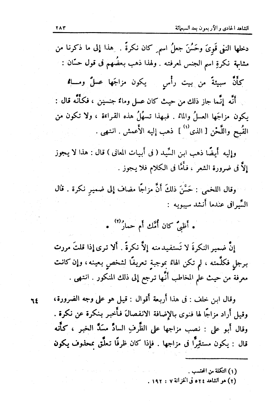 وَقَالَ اللَّخْمِيّ: حسن ذَلِك أَن مزاجاً مُضَاف إِلَى ضمير نكرَة. قَالَ السيرافي عِنْدَمَا أنْشد سِيبَوَيْهٍ: الوافر أظبي كَانَ أمك أم حمَار إِن ضمير النكرَة لَا تستفيد مِنْهُ إِلَّا نكرَة. أَلا ترى إِذا قلت: مَرَرْت بِرَجُل فكلمته لم تكن الْهَاء بموجبة تعريفاً لشخص بِعَيْنِه وَإِن كَانَت معرفَة من حَيْثُ علم الْمُخَاطب أَنَّهَا ترجع إِلَى ذَلِك المنكور. انْتهى.