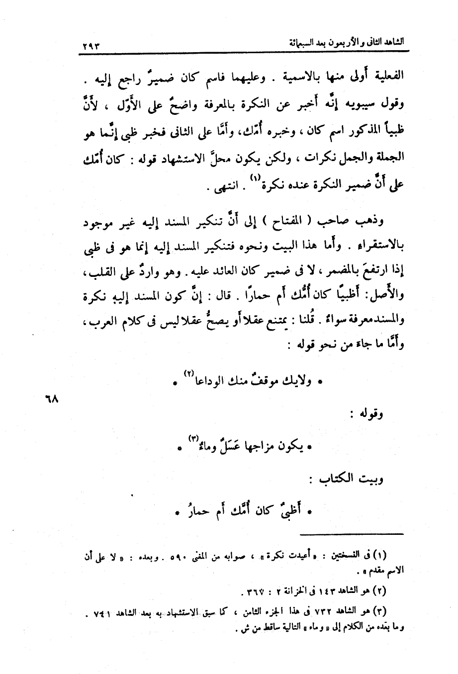 وَذهب صَاحب الْمِفْتَاح إِلَى أَن تنكير الْمسند إِلَيْهِ غير مَوْجُود بالاستقراء. وَأما هَذَا الْبَيْت وَنَحْوه فتنكير الْمسند إِلَيْهِ إِنَّمَا هُوَ فِي ظَبْي إِذا ارْتَفع بالمضمر لَا فِي ضمير كَانَ الْعَائِد عَلَيْهِ. وَهُوَ وراد على الْقلب وَالْأَصْل: أظبياً كَانَ أمك أم حمارا قَالَ: إِن كَون الْمسند إِلَيْهِ نكرَة والمسند معرفَة سَوَاء قُلْنَا: يمْتَنع عقلا أَو يَصح عقلا لَيْسَ فِي كَلَام الْعَرَب وَأما مَا جَاءَ من نَحْو قَوْله: وَلَا يَك موقف مِنْك الوداعا وَقَوله: يكون مزاجها عسل وَمَاء أظبي كَانَ أمك أم حمَار
