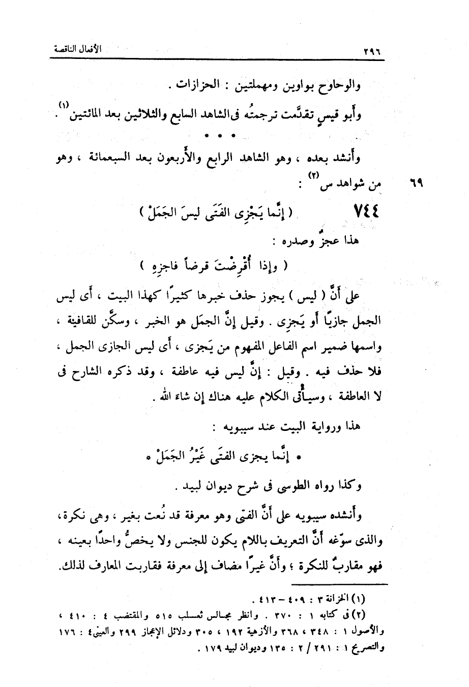 وَهُوَ من شَوَاهِد س: الرمل إِنَّمَا يَجْزِي الْفَتى لَيْسَ الْجمل هَذَا عجز وصدره: وَإِذا أقرضت قرضا فاجزه على أَن لَيْسَ يجوز حذف خَبَرهَا كثيرا كَهَذا الْبَيْت أَي: لَيْسَ الْجمل جازياً أَو يَجْزِي. وَقيل: إِن الْجمل هُوَ الْخَبَر وَسكن للقافية وَاسْمهَا ضمير اسْم الْفَاعِل الْمَفْهُوم من يَجْزِي أَي: لَيْسَ الجازي الْجمل فَلَا حذف فِيهِ. وَقيل: إِن