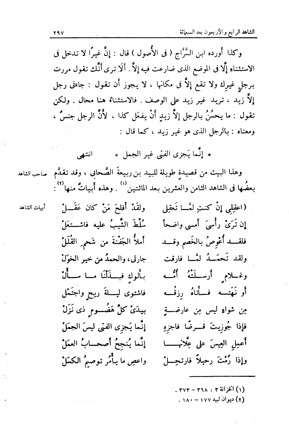 وَهَذَا الْبَيْت من قصيدة طَوِيلَة للبيد بن ربيعَة الصَّحَابِيّ وَقد تقدم بَعْضهَا فِي الشَّاهِد الثَّامِن وَالْعِشْرين بعد الْمِائَتَيْنِ. وَهَذِه أَبْيَات مِنْهَا: الرمل