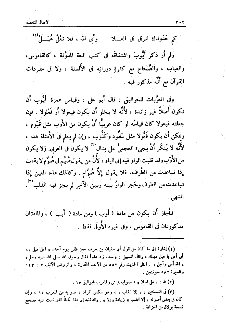 فَإِن جعلته فيعولاً كَانَ قِيَاسه لَو كَانَ عَرَبيا أَن يكون من الأوب مثل قيوم وَيُمكن أَن يكون فعولًا مثل سفود وكلوب وَإِن لم يعلم فِي الْأَمْثِلَة هَذَا لِأَنَّهُ لَا يُنكر أَن يَجِيء العجمي على مِثَال لَا يكون فِي الْعَرَبِيّ. وَلَا يكون من