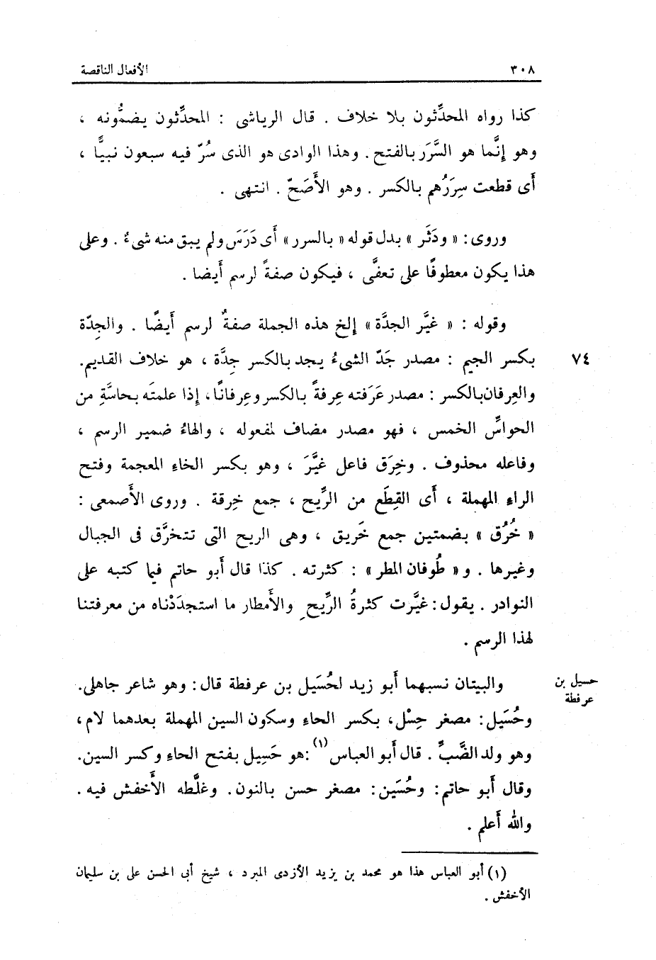 وَقَوله: غير الْجدّة ... إِلَخ هَذِه الْجُمْلَة صفة لرسم أَيْضا. وَالْجدّة بِكَسْر الْجِيم: مصدر جد الشَّيْء يجد بِالْكَسْرِ جدة هُوَ خلاف الْقَدِيم. والعرفان بِالْكَسْرِ: مصدر عَرفته عَرَفَة بِالْكَسْرِ وعرفاناً إِذا عَلمته بحاسة من الْحَواس الْخمس فَهُوَ مصدر مُضَاف لمفعوله وَالْهَاء ضمير الرَّسْم وفاعله مَحْذُوف. وخرق: فَاعل غير وَهُوَ بِكَسْر الْخَاء الْمُعْجَمَة وَفتح الرَّاء الْمُهْملَة أَي: الْقطع من الرّيح جمع خرقَة.
