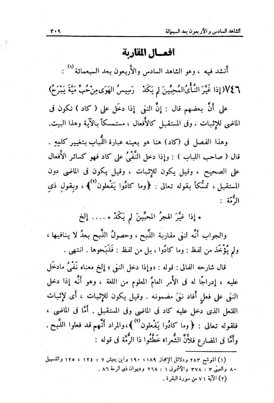 أما فِي الْمَاضِي فَلقَوْله تَعَالَى: وَمَا كَادُوا يَفْعَلُونَ وَالْمرَاد أَنهم قد فعلوا الذّبْح. وَأما فِي الْمُضَارع فَلِأَن الشُّعَرَاء خطؤوا ذَا الرمة فِي قَوْله: ...