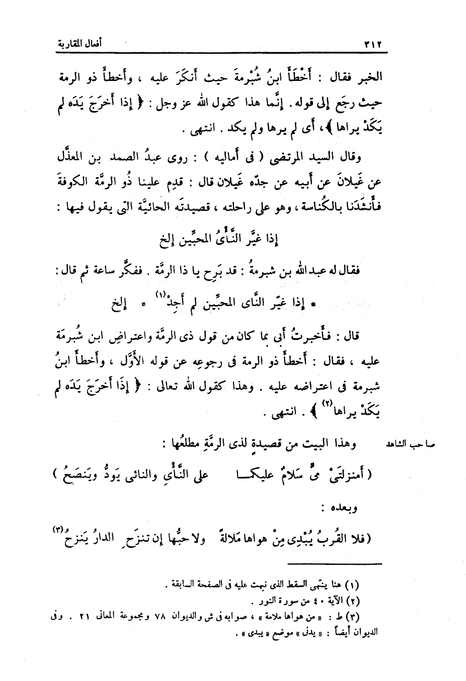 عَن أَبِيه عَن جده غيلَان قَالَ: قدم علينا ذُو الرمة الْكُوفَة فأنشدنا بالكناسة وَهُوَ على رَاحِلَته قصيده الحائية إِذا غير النأي المحبين إِلَخ فَقَالَ لَهُ عبد الله بن شبْرمَة: قد برح يَا ذَا الرمة. ففكر سَاعَة ثمَّ قَالَ: إِذا غير النأي المحبين لم أجد إِلَخ قَالَ: فَأخْبرت أبي بِمَا كَانَ من قَول ذِي الرمة وَاعْتِرَاض ابْن شبْرمَة عَلَيْهِ فَقَالَ: أَخطَأ ذُو الرمة فِي رُجُوعه عَن قَوْله الأول وَأَخْطَأ ابْن شبْرمَة فِي اعتراضه عَلَيْهِ. وَهَذَا كَقَوْل الله تَعَالَى: إِذا أخرج يَده لم يكد يَرَاهَا. انْتهى.