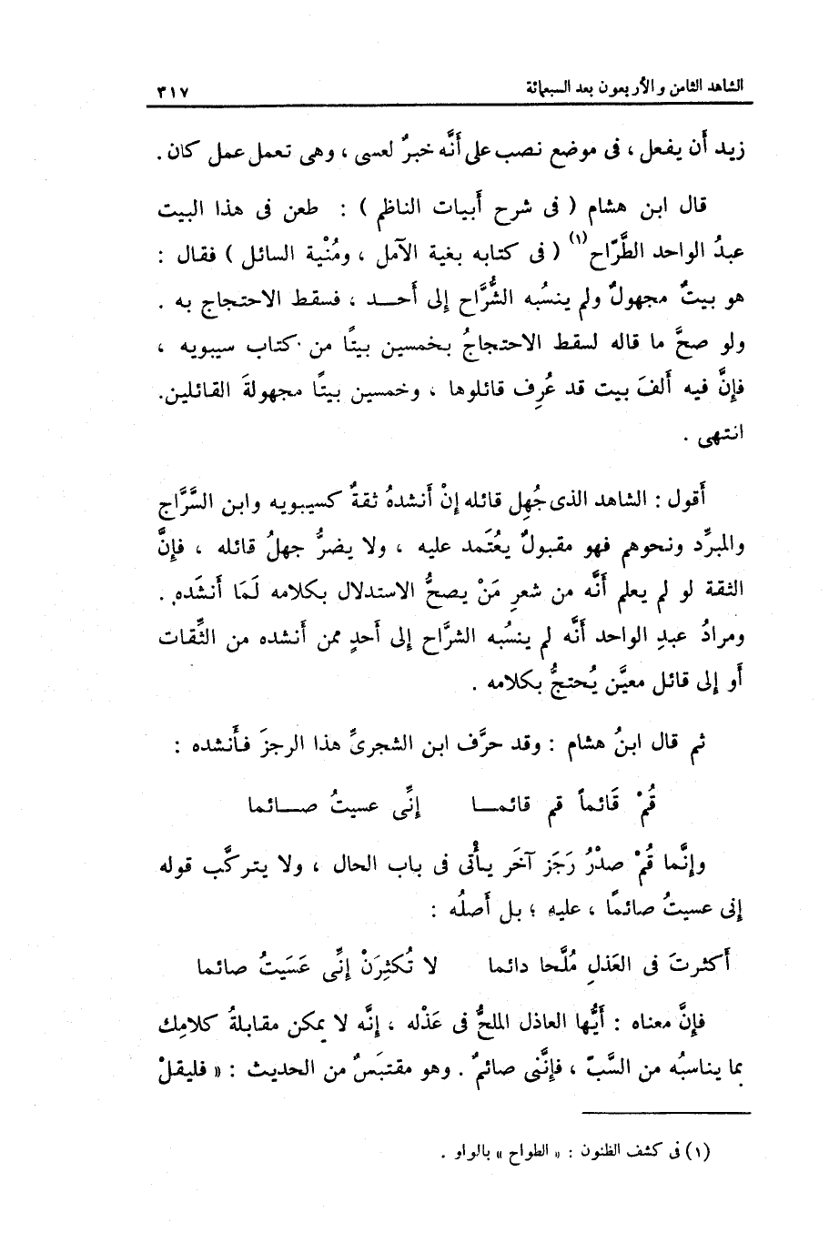 قَالَ ابْن هِشَام فِي شرح أَبْيَات النَّاظِم: طعن فِي هَذَا الْبَيْت عبد الْوَاحِد الطراح فِي كِتَابه بغية الآمل ومنية السَّائِل. فَقَالَ: هُوَ بَيت مَجْهُول لم ينْسبهُ الشُّرَّاح إِلَى أحد فَسقط الِاحْتِجَاج بِهِ.