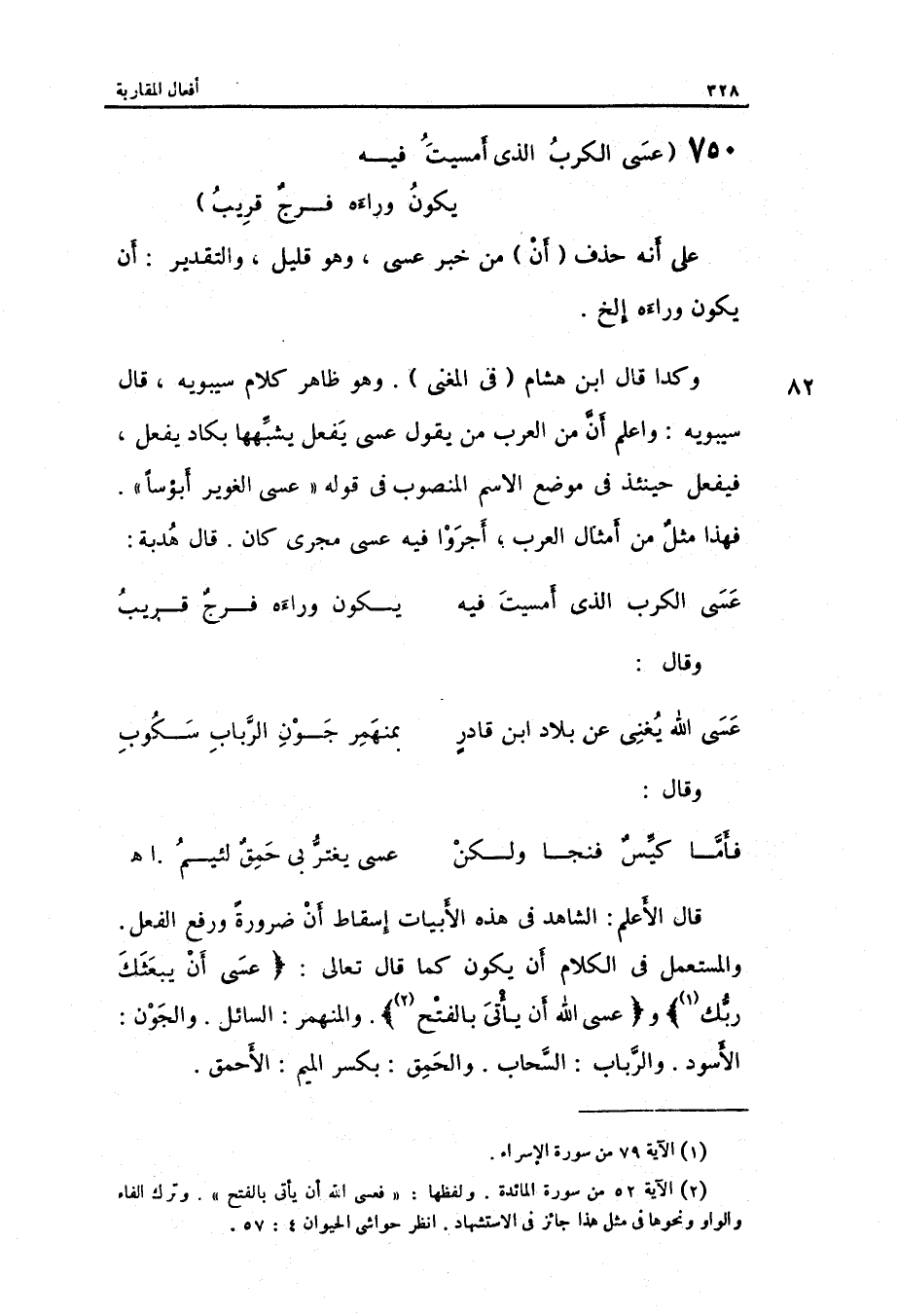 وَكَذَا قَالَ ابْن هِشَام فِي الْمُغنِي وَهُوَ ظَاهر كَلَام سِيبَوَيْهٍ قَالَ سِيبَوَيْهٍ: وَاعْلَم أَن من الْعَرَب من يَقُول: عَسى يفعل يشبهها بكاد يفعل فيفعل حِينَئِذٍ فِي مَوضِع الِاسْم الْمَنْصُوب فِي قَوْله عَسى الغوير أبؤساً. فَهَذَا مثل من أَمْثَال الْعَرَب أجروا فِيهِ عَسى مجْرى كَانَ.