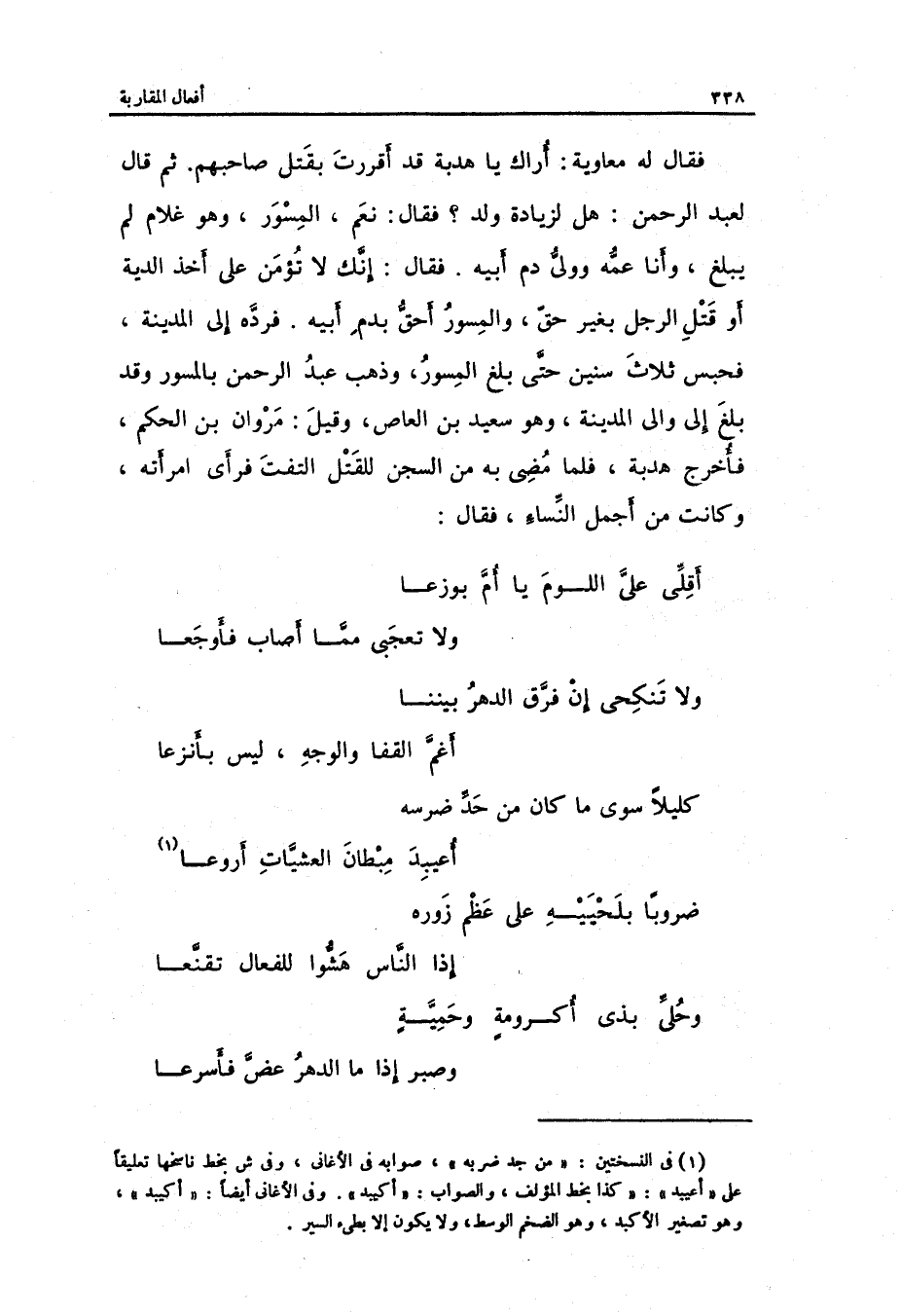 وَذهب عبد الرَّحْمَن بالمسور وَقد بلغ إِلَى وَالِي الْمَدِينَة وَهُوَ سعيد بن الْعَاصِ وَقيل: مَرْوَان بن الحكم فَأخْرج هدبة فَلَمَّا مُضِيّ بِهِ من السجْن للْقَتْل والتفت فَرَأى امْرَأَته وَكَانَت من أجمل النِّسَاء فَقَالَ: الطَّوِيل