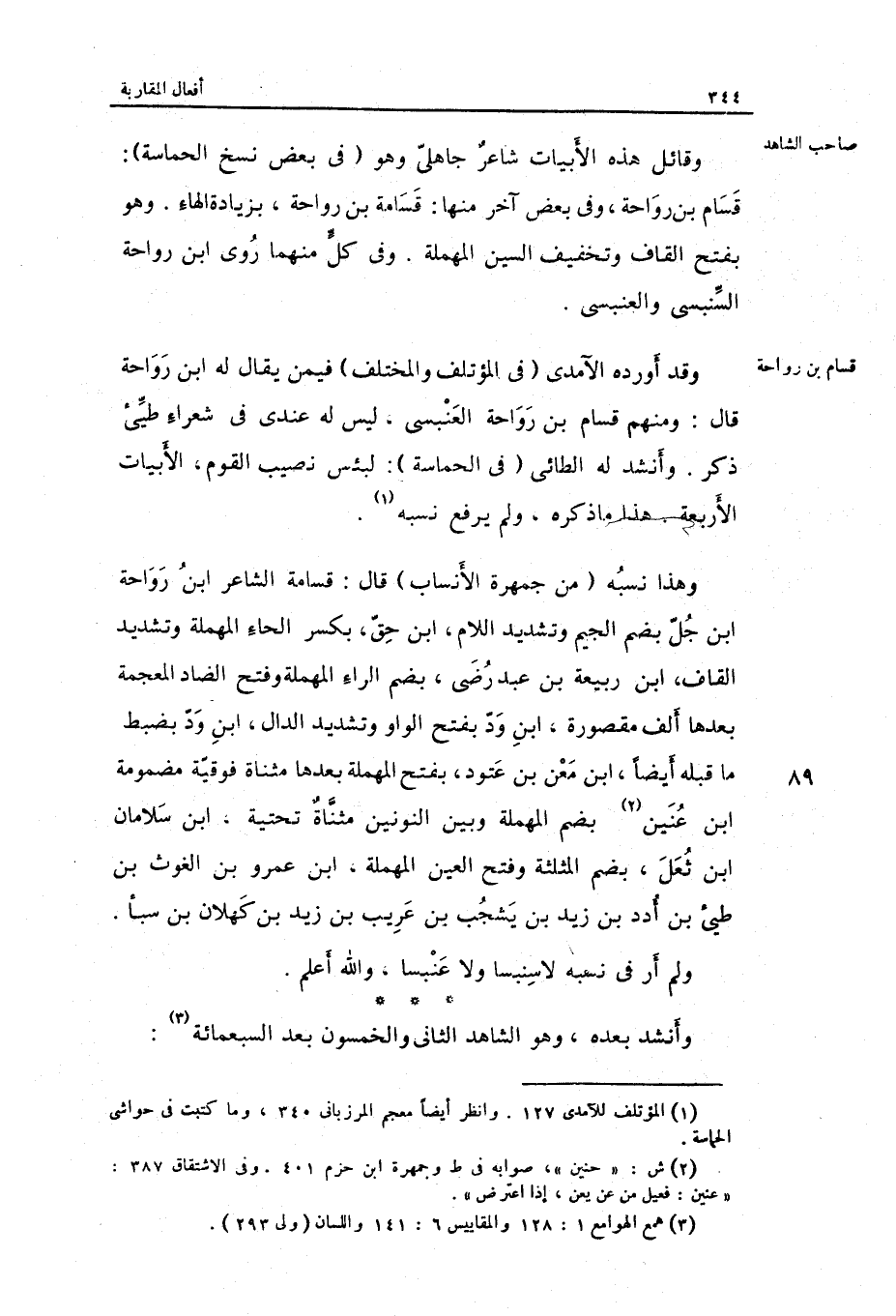 وَقد أوردهُ الْآمِدِيّ فِي المؤتلف والمختلف فِيمَن يُقَال لَهُ ابْن رَوَاحَة قَالَ: وَمِنْهُم قسام بن رَوَاحَة العنبسي لَيْسَ لَهُ عِنْدِي فِي شعراء طَيئ ذكر. وَأنْشد لَهُ الطَّائِي فِي الحماسة: لبئس نصيب الْقَوْم الأبيات الْأَرْبَعَة. هَذَا مَا ذكره وَلم يرفع نسبه.