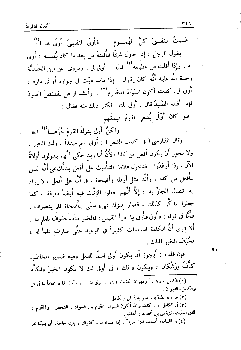 وَقَالَ الْفَارِسِي فِي كتاب الشّعْر: أولى: اسْم مُبْتَدأ وَلَك: الْخَبَر. وَلَا يجوز أَن يكون أفعل من كَذَا لِأَن أَبَا زيد حكى أَنهم يَقُولُونَ: أولاة الْآن إِذا أوعدوا.