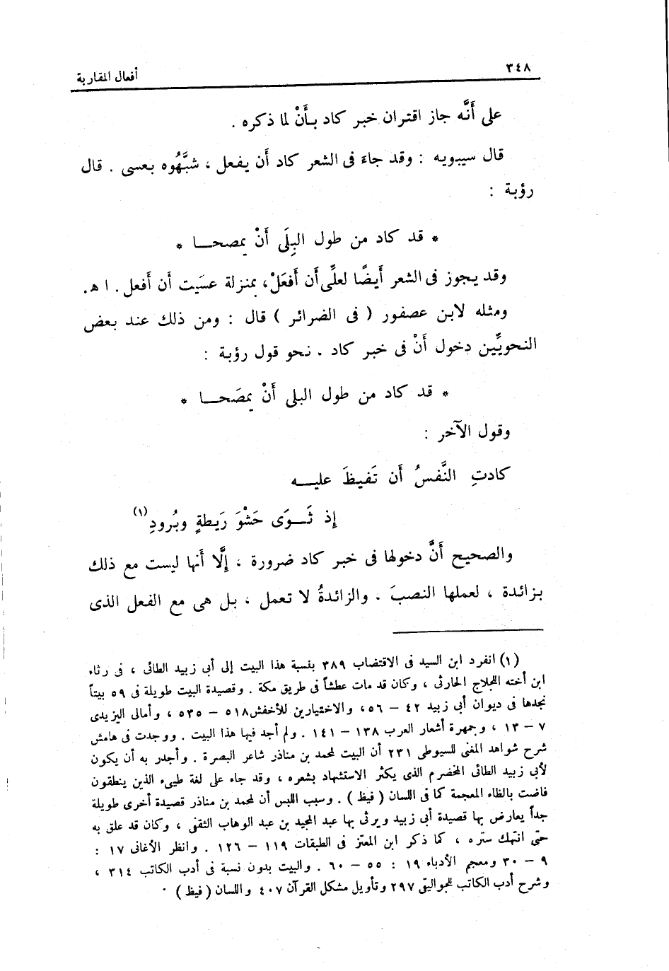 وَمثله لِابْنِ عُصْفُور فِي الضرائر قَالَ: وَمن ذَلِك عِنْد بعض النَّحْوِيين دُخُول أَن فِي خبر كَاد نَحْو قَول رؤبة: قد كَاد من طول البلى أَن يمصحا وَقَول الآخر: الْخَفِيف