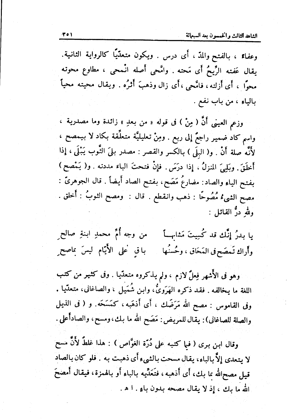 وَقَالَ ابْن بري فِيمَا كتبه على درة الغواص: هَذَا غلط لِأَن مسح لَا يتَعَدَّى إِلَّا بِالْبَاء يُقَال: مسحت بالشَّيْء أَي: ذهبت بِهِ. فَلَو كَانَ بالصَّاد قيل: مصح الله بِمَا بك أَي: أذهبه فتعديه بِالْبَاء أَو بِالْهَمْزَةِ فَيُقَال: أمصح الله مَا بك إِذْ لَا يُقَال مصحه بِدُونِ بَاء. اه.