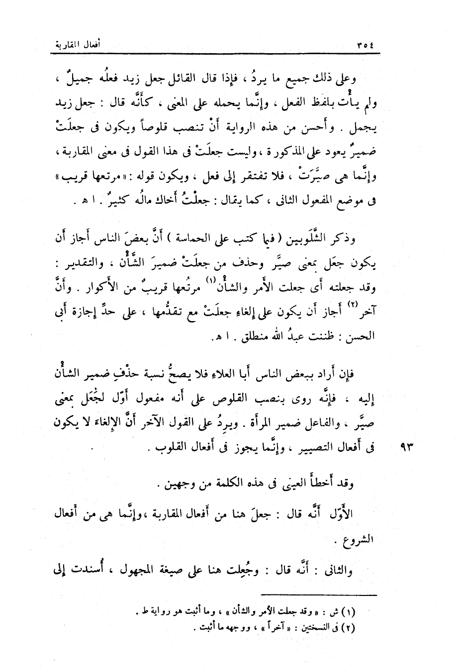 فَإِن أَرَادَ بِبَعْض النَّاس أَبَا الْعَلَاء فَلَا يَصح نِسْبَة حذف ضمير الشَّأْن إِلَيْهِ فَإِنَّهُ روى بِنصب القلوص على أَنه مفعول أول لجعل بِمَعْنى صير وَالْفَاعِل ضمير الْمَرْأَة. وَيرد على القَوْل الآخر أَن الإلغاء لَا يكون فِي أَفعَال التصيير وَإِنَّمَا يجوز فِي أَفعَال الْقُلُوب.